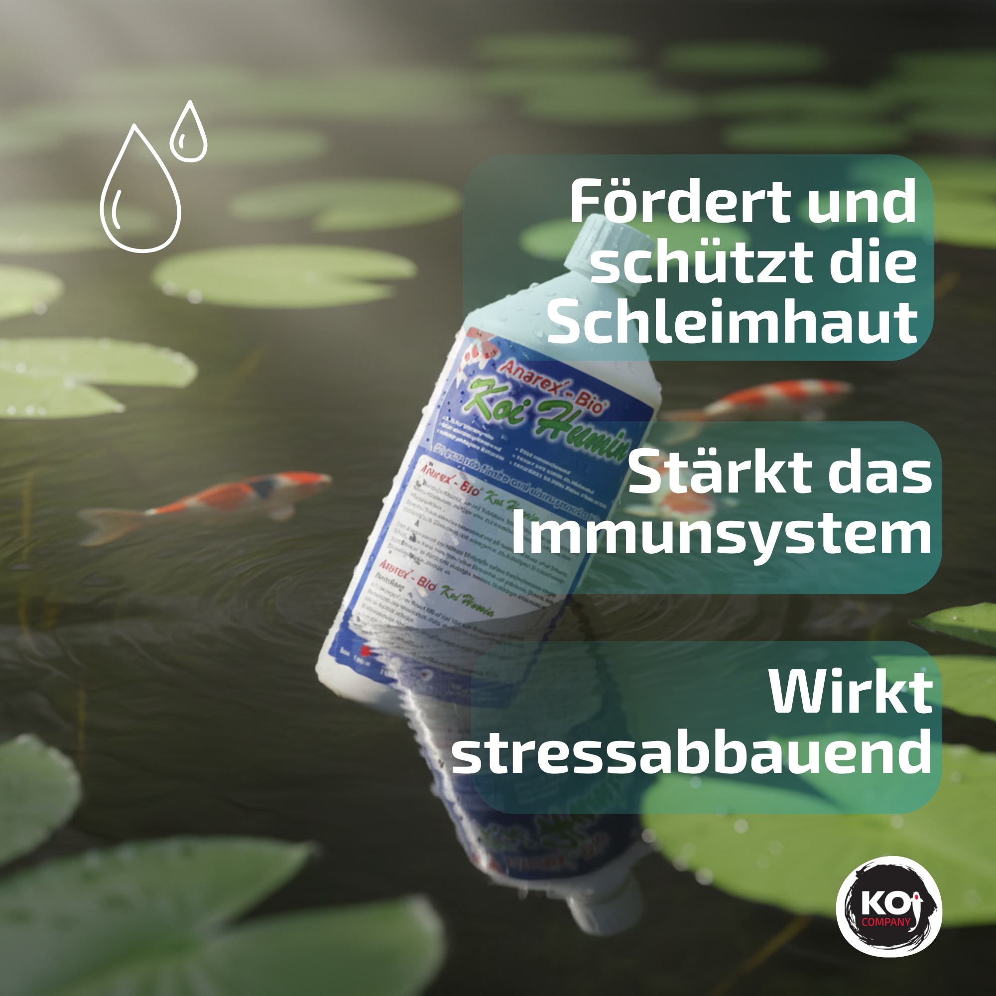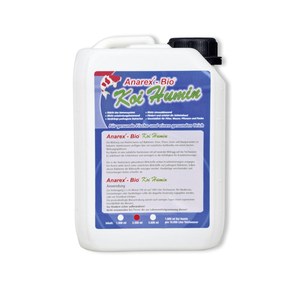 Koi-Humin ist eine natürliche Huminsäure mit pH-neutraler Wirkung auf das Teichwasser. Es stabilisiert die Schleimhaut und verringert so die Anfälligkeit für Krankheitserreger.