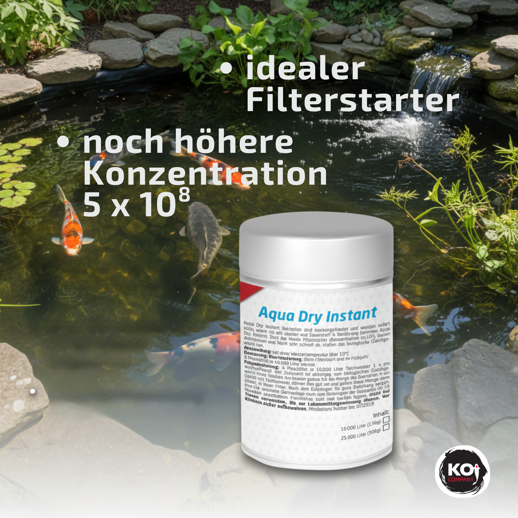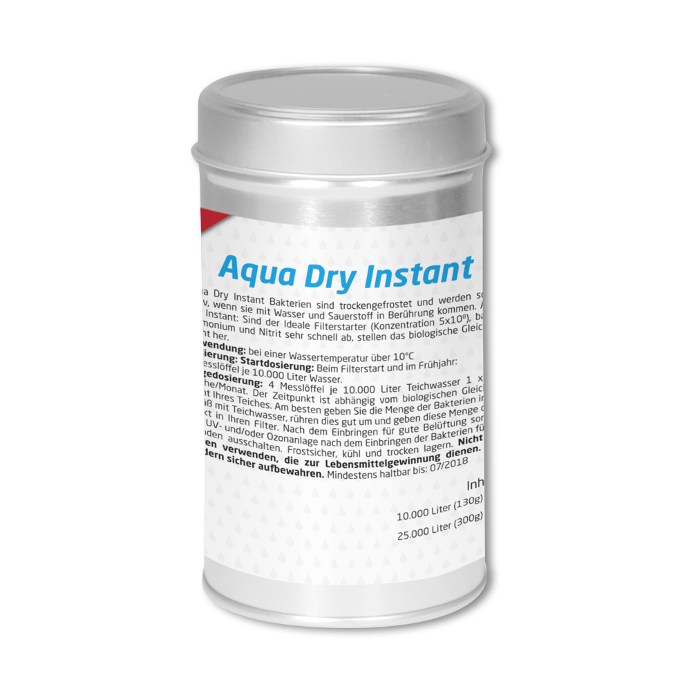 Aqua Dry Instant sind trockengefrostet und werden sofort aktiv, wenn sie mit Wasser und Sauerstoff in Berührung kommen. Sofort nach dem Einbringen in den Teich oder Filter vermehren sich die Bakterien explosionsartig, so dass die gewünschte Wirkung innerhalb von 12-36 Stunden eintritt. Die Aqua Dry Instant Bakterien entfalten ihre Tätigkeit ab einer Wassertemperatur über 10°C. Sie eignen sich vorzüglich, um einen Teich nach dem Winter zu aktivieren oder einen Filter, der durch starken Medikamenteneinsatz beeinträchtigt wurde, neu zu kultivieren. Im Fall von Medikamentenverwendung müssen die Medikamentenrückstände aber erst durch umfangreichen Wasserwechsel oder durch Aktivkohle herausgefiltert werden. Aqua Dry Instant Bakterien sind verschlossen und trocken 3 Jahre haltbar, so dass Sie problemlos größere Gebinde bestellen und nach Bedarf die notwendige Dosierung vornehmen können.