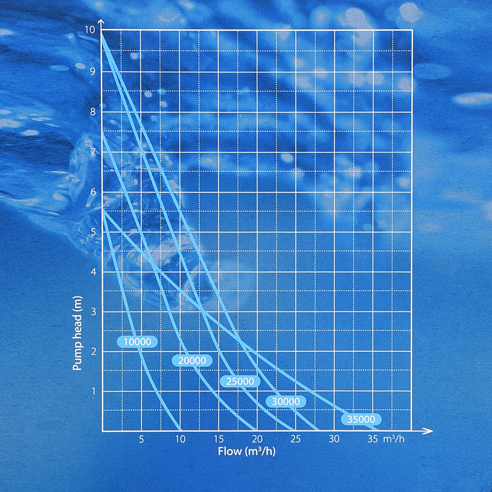 Das Modell 35 000 Wifi ist aufgrund seiner Ein- und Ausgäng und der Förderhöhe speziell bei Schwerkraftanlagen zu verwenden, also nach dem Filter. Sie kann viel Wasser mit "wenig" Energie zum Teich pumpen. Wir empfehlen 90er oder 110er Rohr.