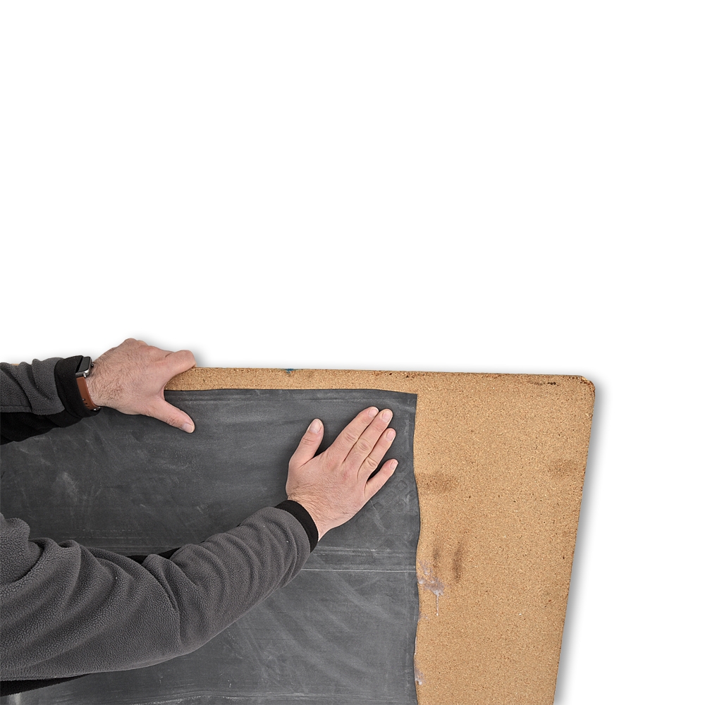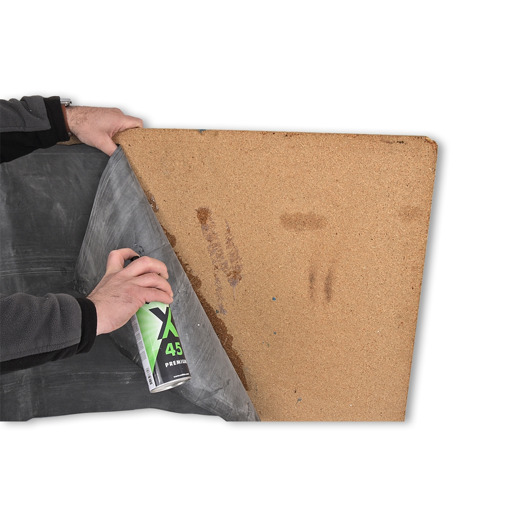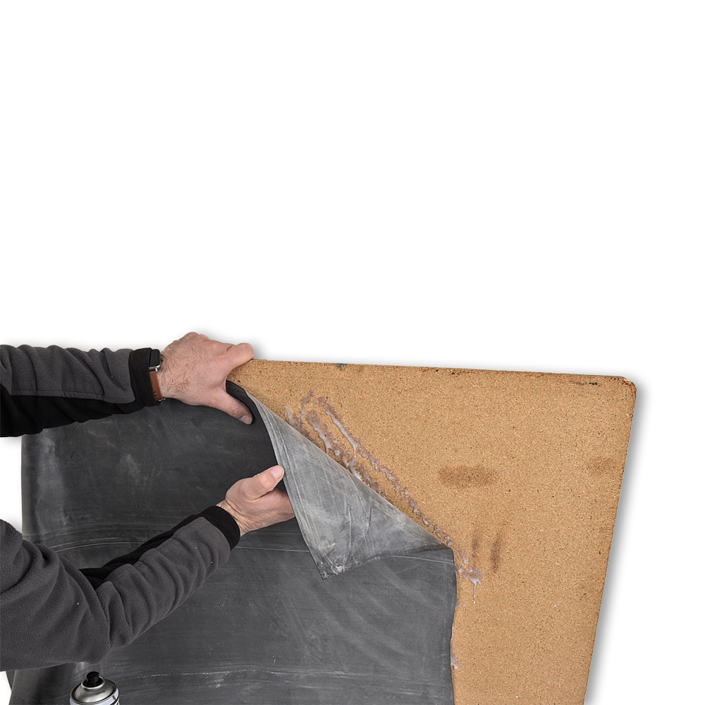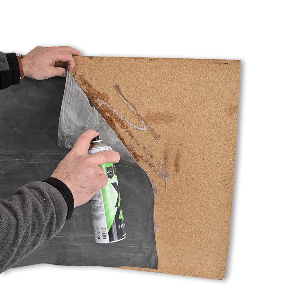 - Folie und die zu beklebende Fläche mit Kleber einsprühen und nach 2-4 Minuten Ablüftzeit beide Flächen miteinander verkleben
