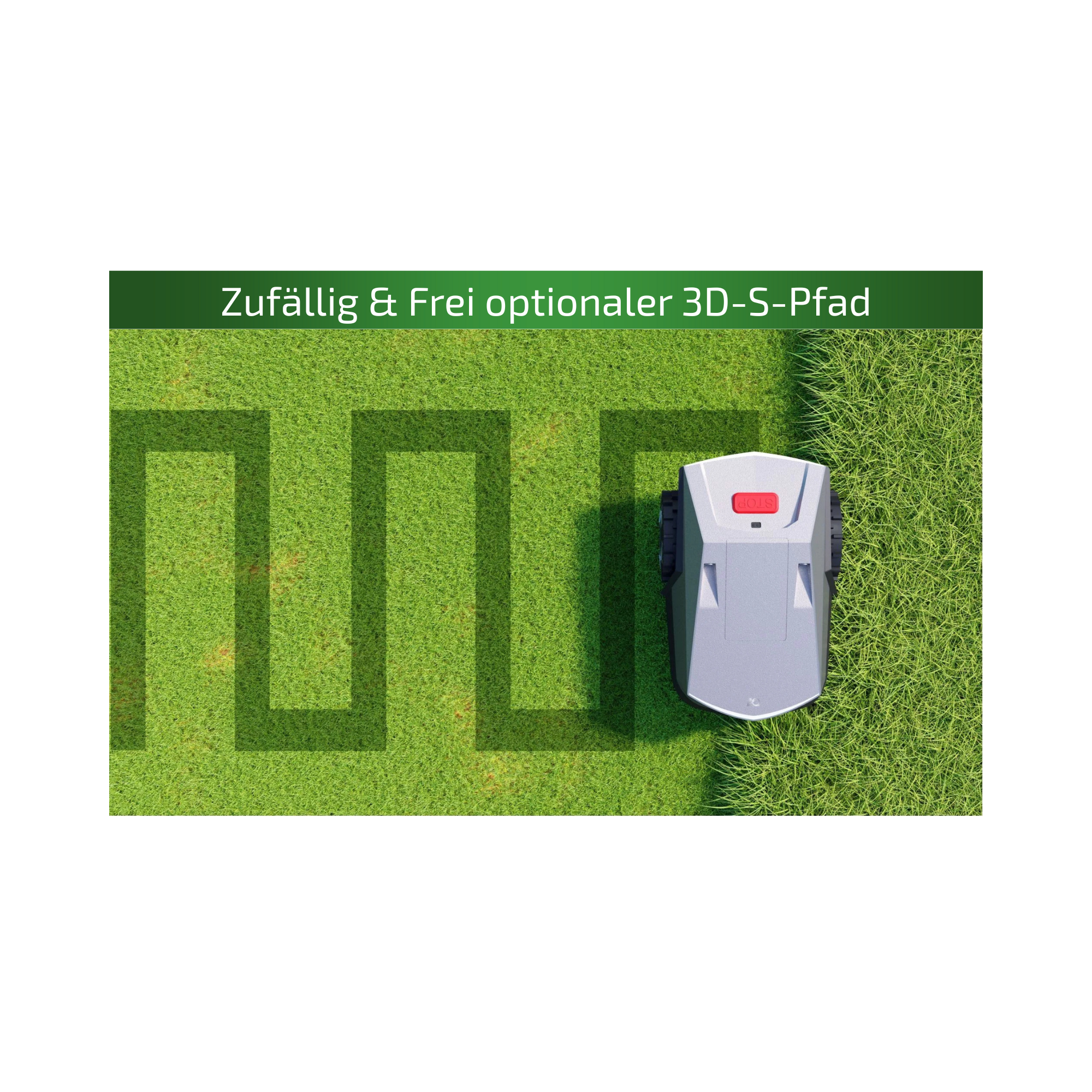 • Zufällig & Frei optionaler 3D-S-Pfad: Der Roboter bietet als Erster diese Funktionalität und damit die breiteste Abdeckung unterschiedlicher Gartenbedingungen