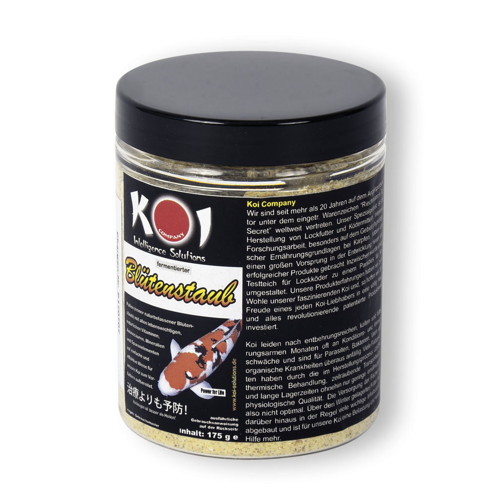 Der Pollen besitzt ungewöhnlich nährende, energetische und den Stoffwechsel fördernde Eigenschaften. Pollen haben eine antibiotische Wirkung, begünstigen die Eiweiß-Synthese analog mit einer schnelleren und glatten Vernarbung von Wunden. Der Pollen ist eines der Naturprodukte mit dem höchsten Anteil an Aminosäuren. Pollen fördern das Wachstum, geben Kraft und unterstützen die Farben auf natürliche Weise. Zur optimalen Ausfärbung der Koi, besonders gutem Wachstum, besseren Futterverwertung und Stärkung des Immunsystems haben wir insgesamt mehr als 10% reines BetaCarotin und Canthaxanthin, Methionin, Lysin, Threonin und Tryptophan der Mischung zugegeben.