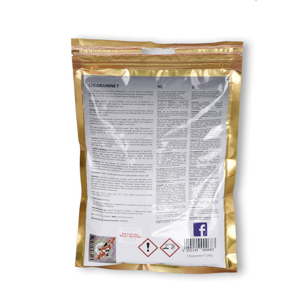 Dies wiederholen Sie nach 24 Stunden für die Dauer von maximal 5 Tagen. Gegen Parasiten oder bakterielle Infektionen braucht man 3,2 Gramm pro 1000 Liter Teichwasser. Wiederholen Sie die Dosierung nach 24 Stunden für die Dauer von maximal 4 Tagen. Falls nötig, kann die Behandlung nach 14 Tagen wiederholt werden. Um einen Schock im Teich zu vermeiden, gießen Sie die Lösung über den Zeitraum von einer Stunde in den Teich. Der Filter muss abgeschaltet werden. Vor Gebrauch unbedingt pH und KH kontrollieren, da Chloramin T bei weichem Wasser giftig sein kann.