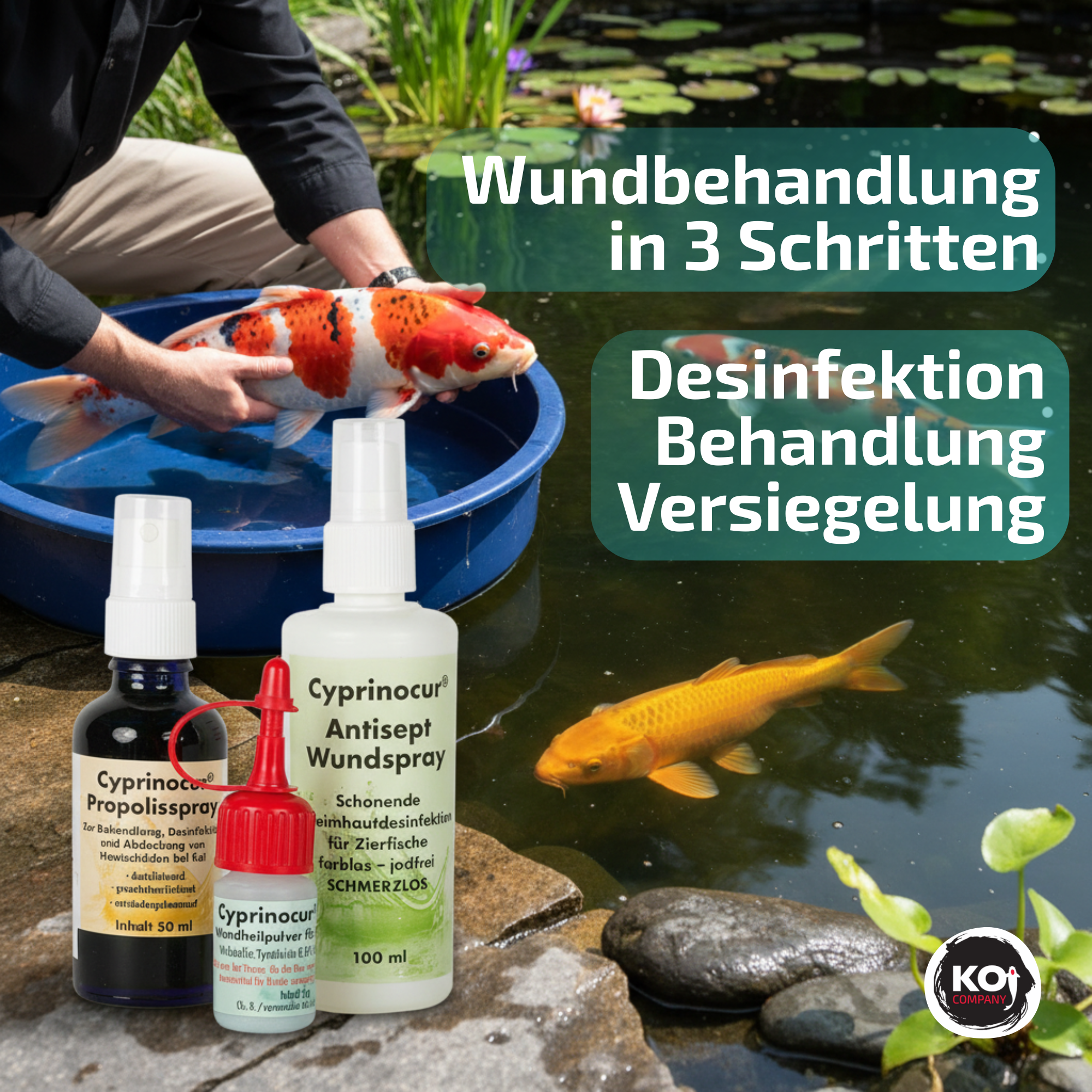 - Behandlung: Cyprinocur Antisept wurde entwickelt, um dem Koi Halter die Möglichkeit zu geben, Wunden schnell und schonend zu desinfizieren.