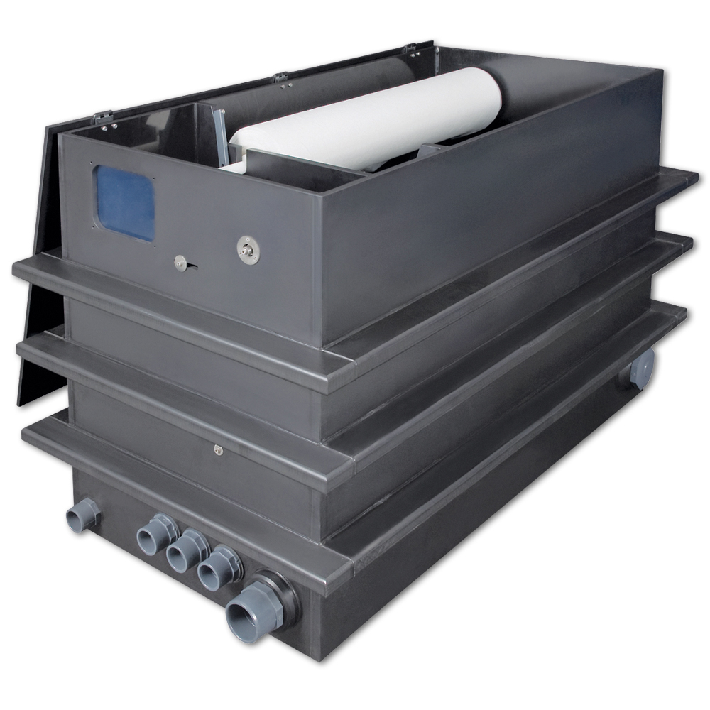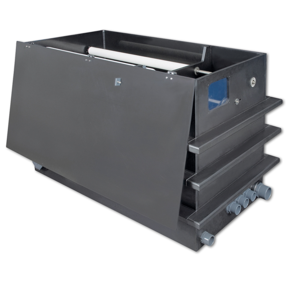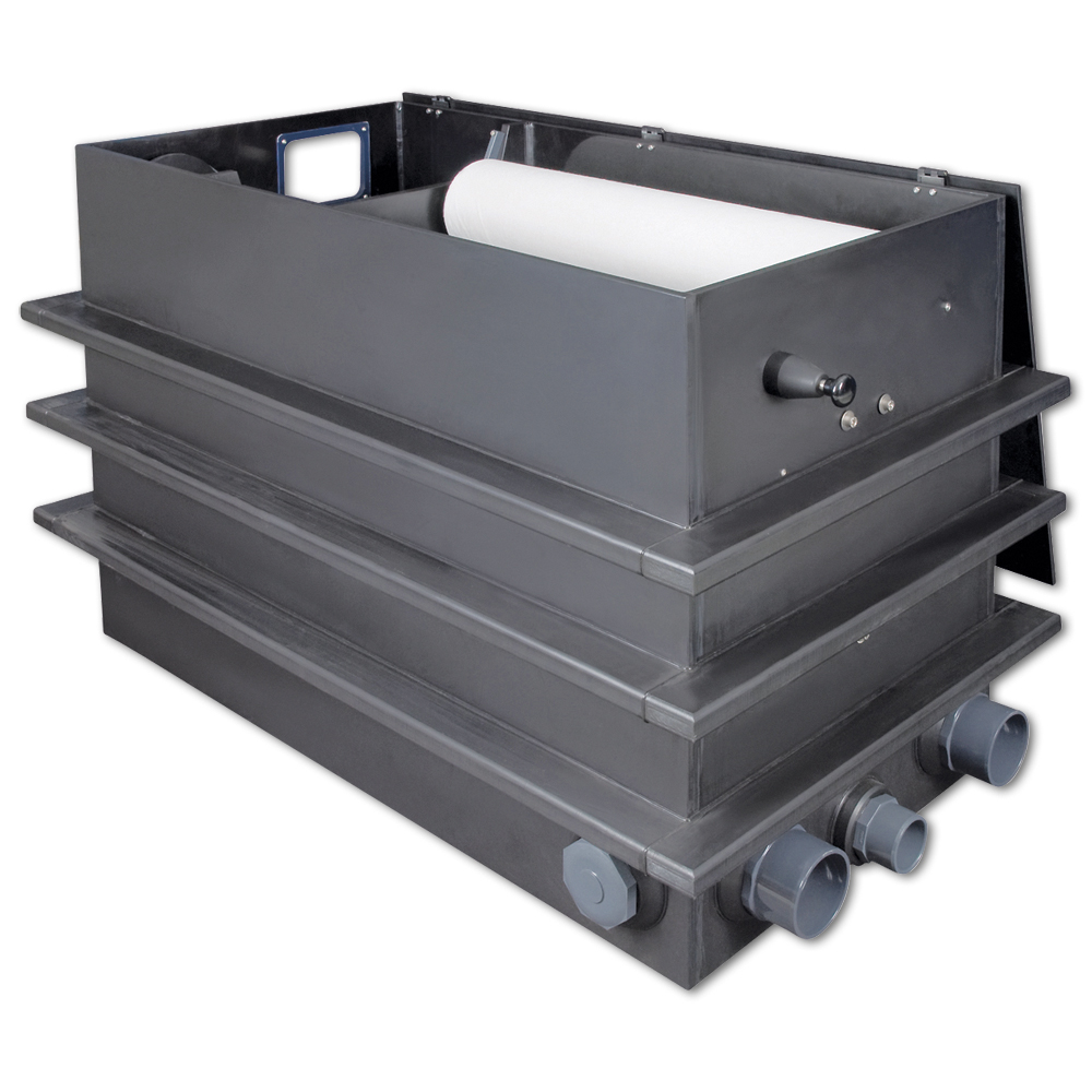 Die Funktionsweise des Filters ist so einfach, das es schon fast unglaublich klingt. Eine Pumpe fördert das Wasser in den Filter. Das Wasser muss durch Papiervlies, das sofort alle Schwebepartikel zurückhält. Das saubere Wasser gelangt in die Biostufe, in der nun gelöste Stoffe wie Ammonium und Nitrit abgebaut werden und von dort gelangt das Wasser wieder zurück in den Teich. Mit der Zeit verstopft das Filtervlies immer mehr und der Wasserstand im Filter steigt an. Über einen Überlauf wird eine Mechanik in Bewegung gesetzt, die das Filtervlies automatisch und ohne Strom weiterbefördert, bis wieder genügend Wasserfluss erreicht wird. Somit wird ein Überlaufen oder eine Filterunterfunktion verhindert.