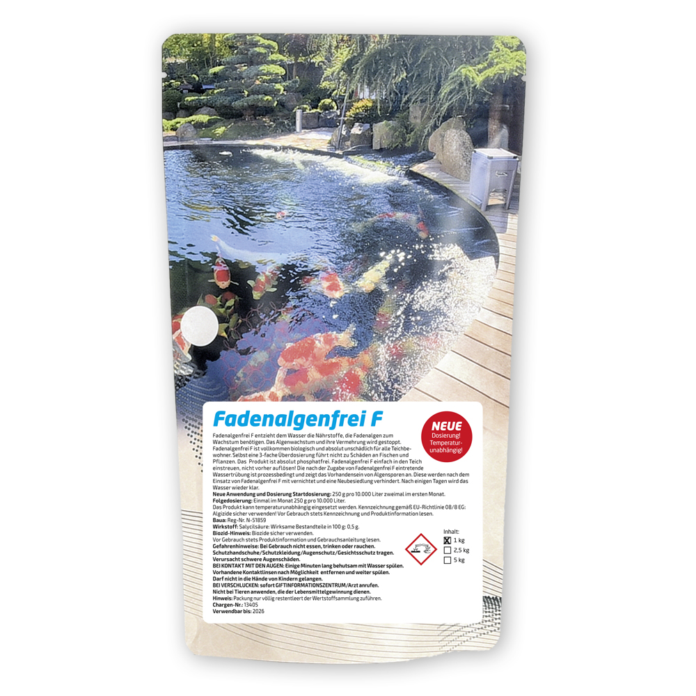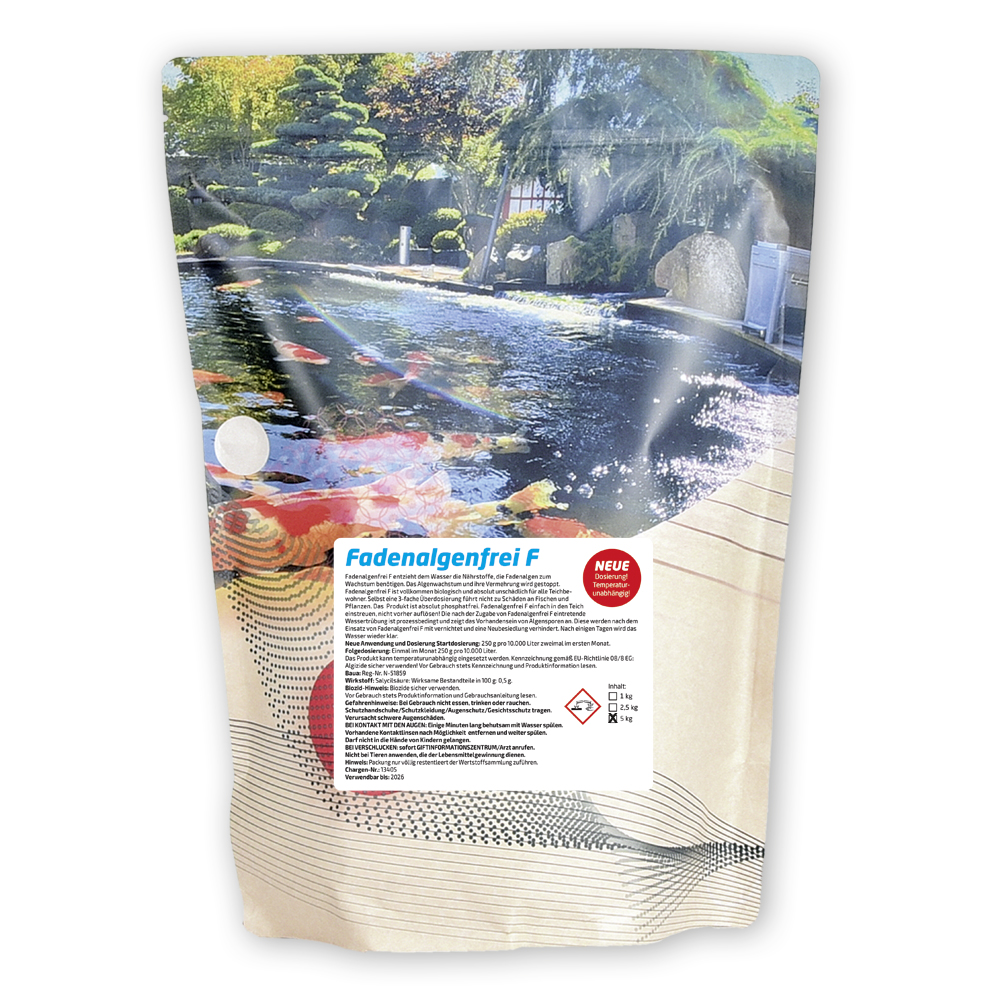 Bei diesem Produkt handelt es sich um einen Fadenalgenvernichter ohne jegliche Zusätze von Algiziden. Die Fadenalge löst sich auf, das Absterben der Algen beginnt und Ihr Teich ist wieder algenfrei. Fadenalgenfrei F ist außerdem absolut phosphat-frei!