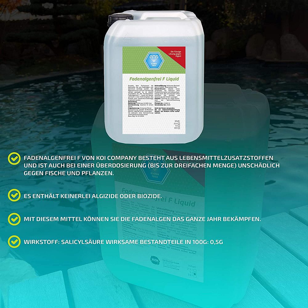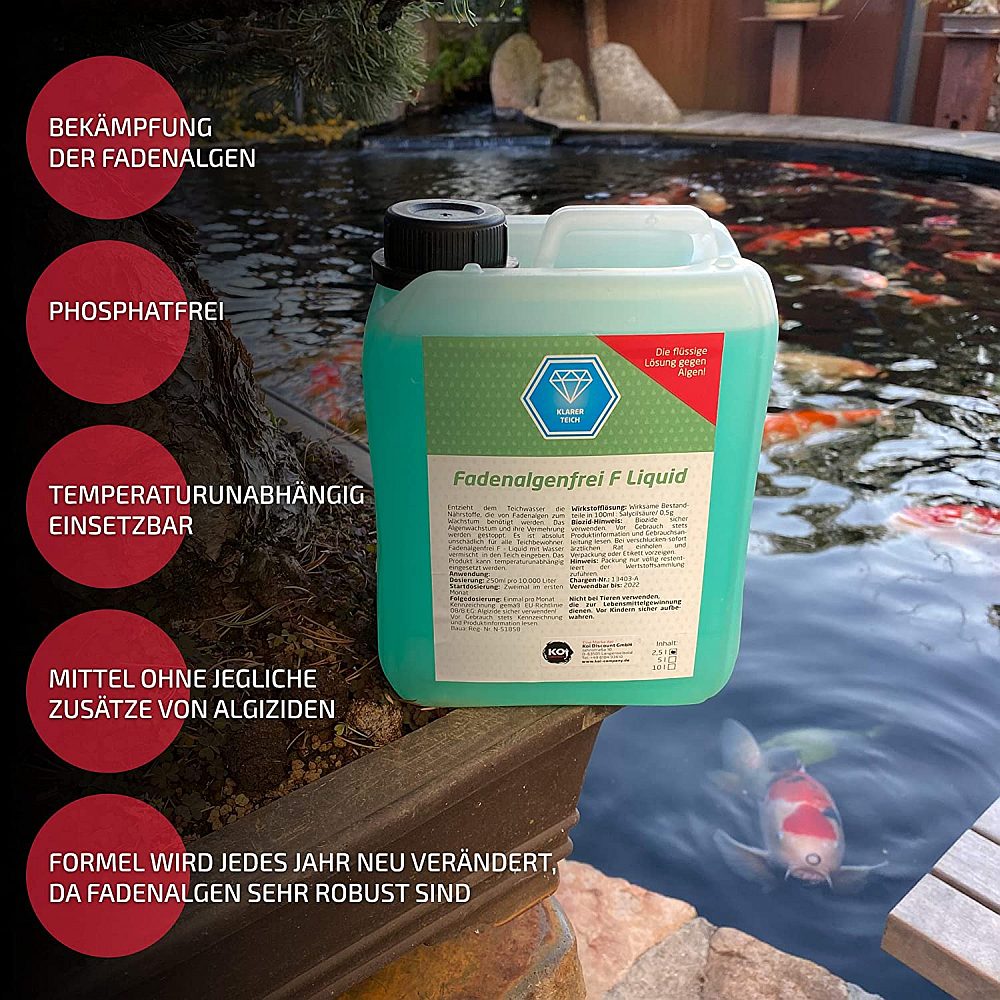 Fadenalgenfrei F von Koi Company besteht aus Lebensmittelzusatzstoffen und ist auch bei einer Überdosierung (bis zur dreifachen Menge) unschädlich gegen Fische und Pflanzen. Dieses Mittel wäre selbst für den menschlichen Verzehr geeignet, es enthält keinerlei Algizide oder Biozide. Sie erwerben ein Mittel, welches die Ursache (Algen) bekämpft und dank seiner Wirkstoffe Ihren Teich von lästigen abgestorbenen Algen freihält, weil sie nicht in dem Umfang von anderen Mittel nachwachsen. Damit auch bei Ihnen das Fadenalgenfrei F wirkt, bedenken Sie bitte folgendes: Die Dosierung muss dem tatsächlichen Wasservolumen entsprechen. Lieber etwas mehr dosieren, als zu wenig.