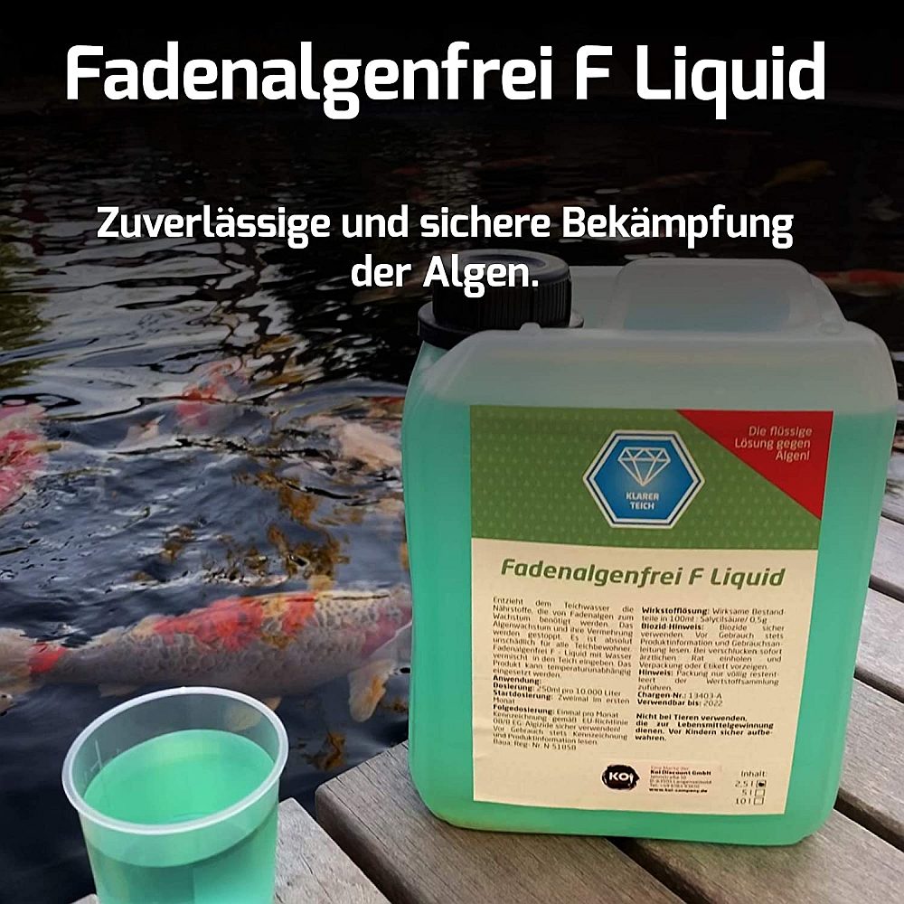 Fadenalgenfrei F Liquid erhalten Sie in dieser Zusammensetzung und unter dieser baua Nr. nur bei Koi Company oder von uns autorisierten Fachhändlern. Leider stellen wir immer wieder fest, dass die Beschreibungen und Dosieranleitungen einfach kopiert werden. In diesen Mitteln sind nicht die gleichen Wirkstoffe wie bei Fadenalgenfrei F Liquid enthalten. Nur mit dem Original erhalten Sie immer eine einwandfreie und überprüfte Ware.