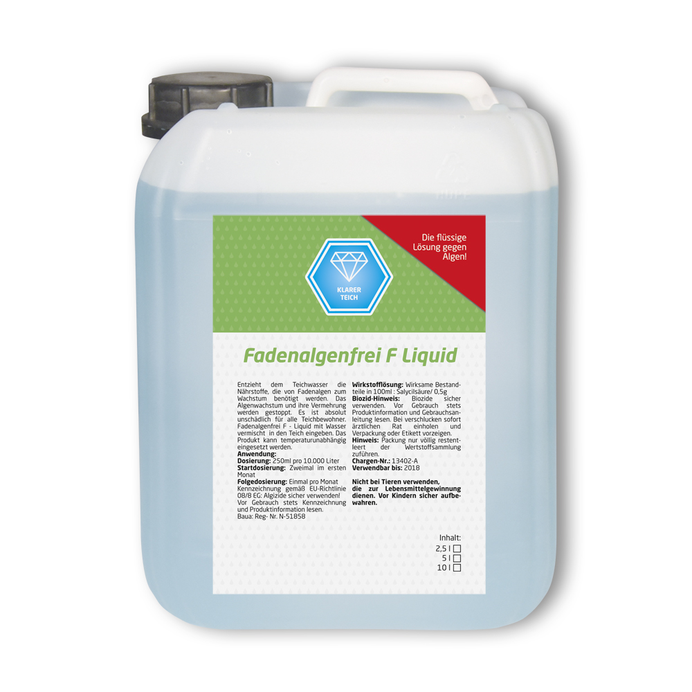 Wir bieten Ihnen unseren Klassiker auch in flüssiger Form an. Der Wirkstoff ist der gleiche wie im Fadenalgenfrei F. Sie können auch zwischen dem Pulver und dem flüssigen Mittel wechseln.