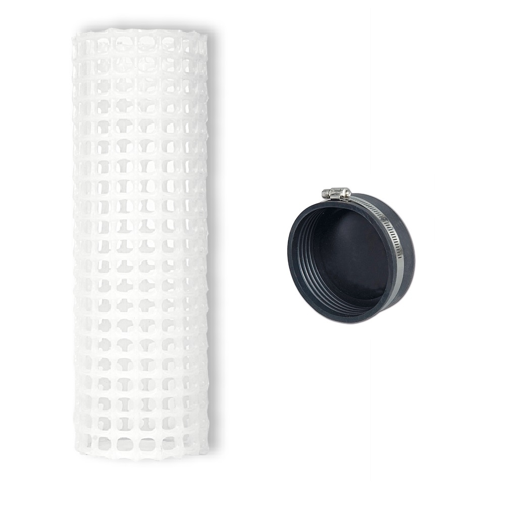 Ein weiteres Einsatzgebiet des Filterrohres ist die Verwendung als Schmutzkorb. Für eine Pumpe kann das Rohr direkt aufgeschraubt werden. Dafür bestellen Sie die flexible Reduziermuffe mitsamt einer Gewindemuffe, die für Ihre Pumpe passend ist. Dann drehen Sie das Rohr einfach drauf.