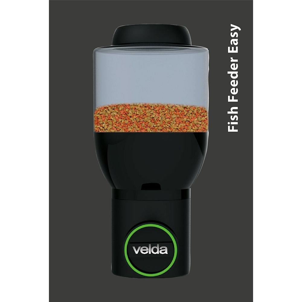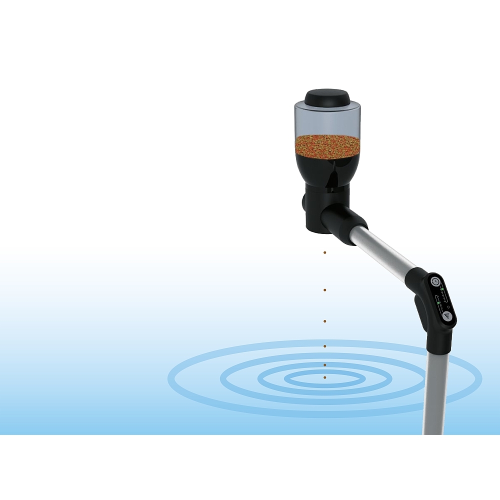 Das Fassungsvermögen des Futterbehälters liegt bei 2,5 Liter Koifutter. Der Futterbehälter besitzt einen transparenten Teil durch den der Futtervorrat immer leicht kontrolliert werden kann.