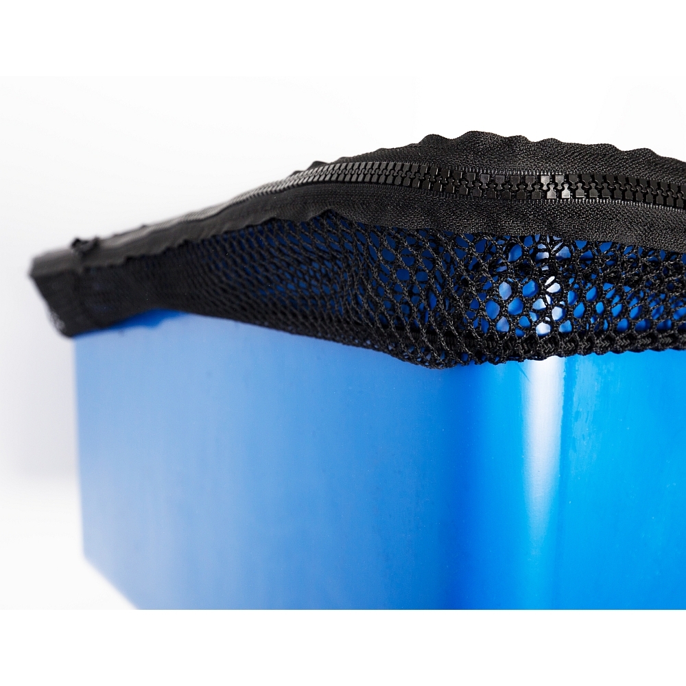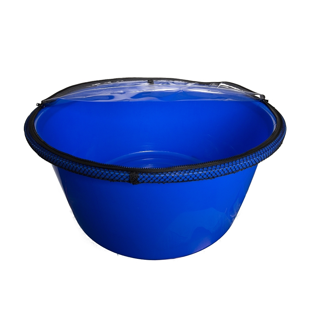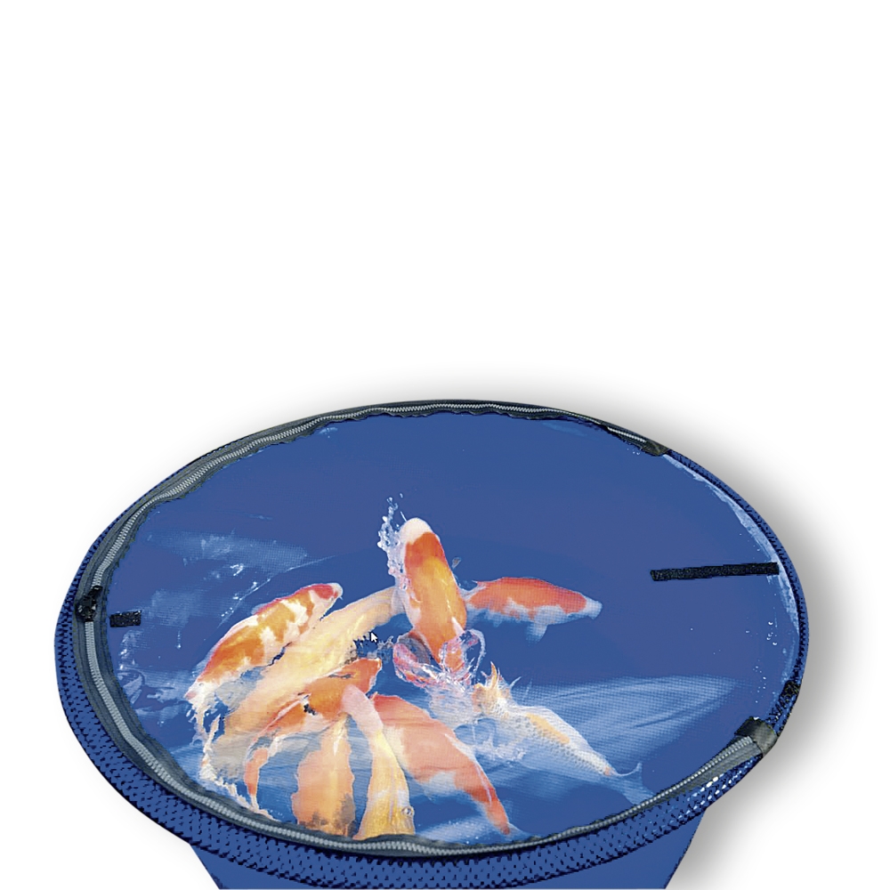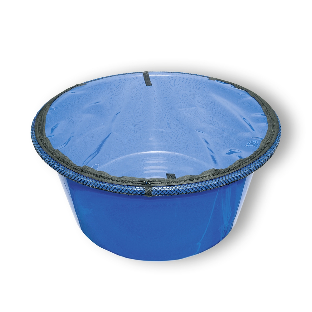 Am Rand wird die Abdeckung von einem Netz fixiert. In dieses Netz ist ein verstellbarer Gummizug eingebracht, der die Abdeckung sicher fixiert. Da kann auch ein noch so großer Fisch springen, die bekommt er nicht runter. Bei der runden Wanne ist noch ein Klettverschluss angebracht, um die umgeklappte Folie zu fixieren. Für kurzzeitige Transporte kann diese Abdeckung auch verwendet werden, da sie ein Herausschwappen des Wassers reduziert.
