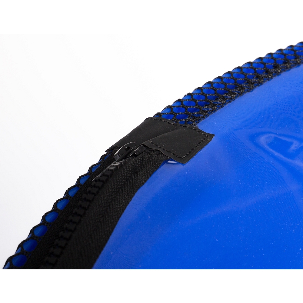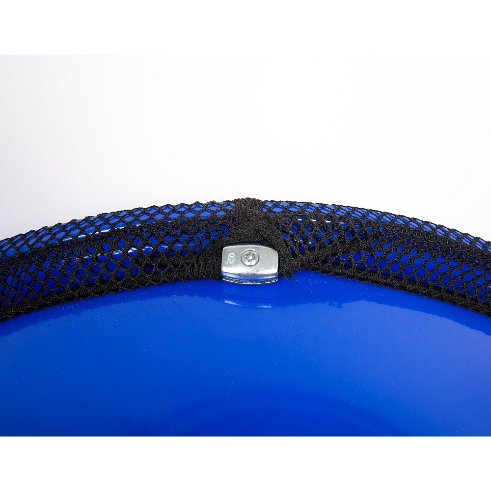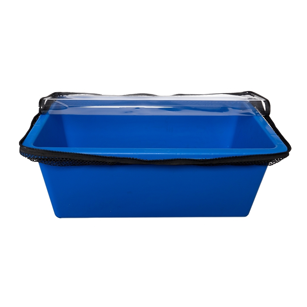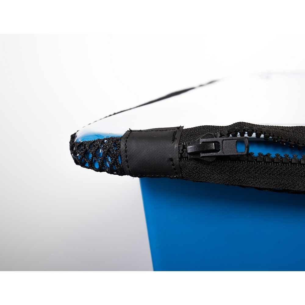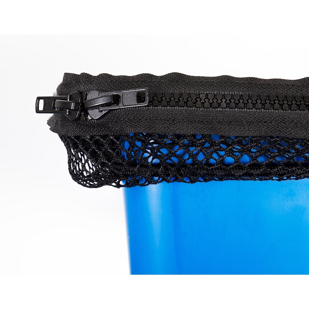 Am Rand wird die Abdeckung von einem Netz fixiert. In dieses Netz ist ein verstellbarer Gummizug eingebracht, der die Abdeckung sicher fixiert. Da kann auch ein noch so großer Fisch springen, die bekommt er nicht runter. Bei der runden Wanne ist noch ein Klettverschluss angebracht, um die umgeklappte Folie zu fixieren. Für kurzzeitige Transporte kann diese Abdeckung auch verwendet werden, da sie ein Herausschwappen des Wassers reduziert.