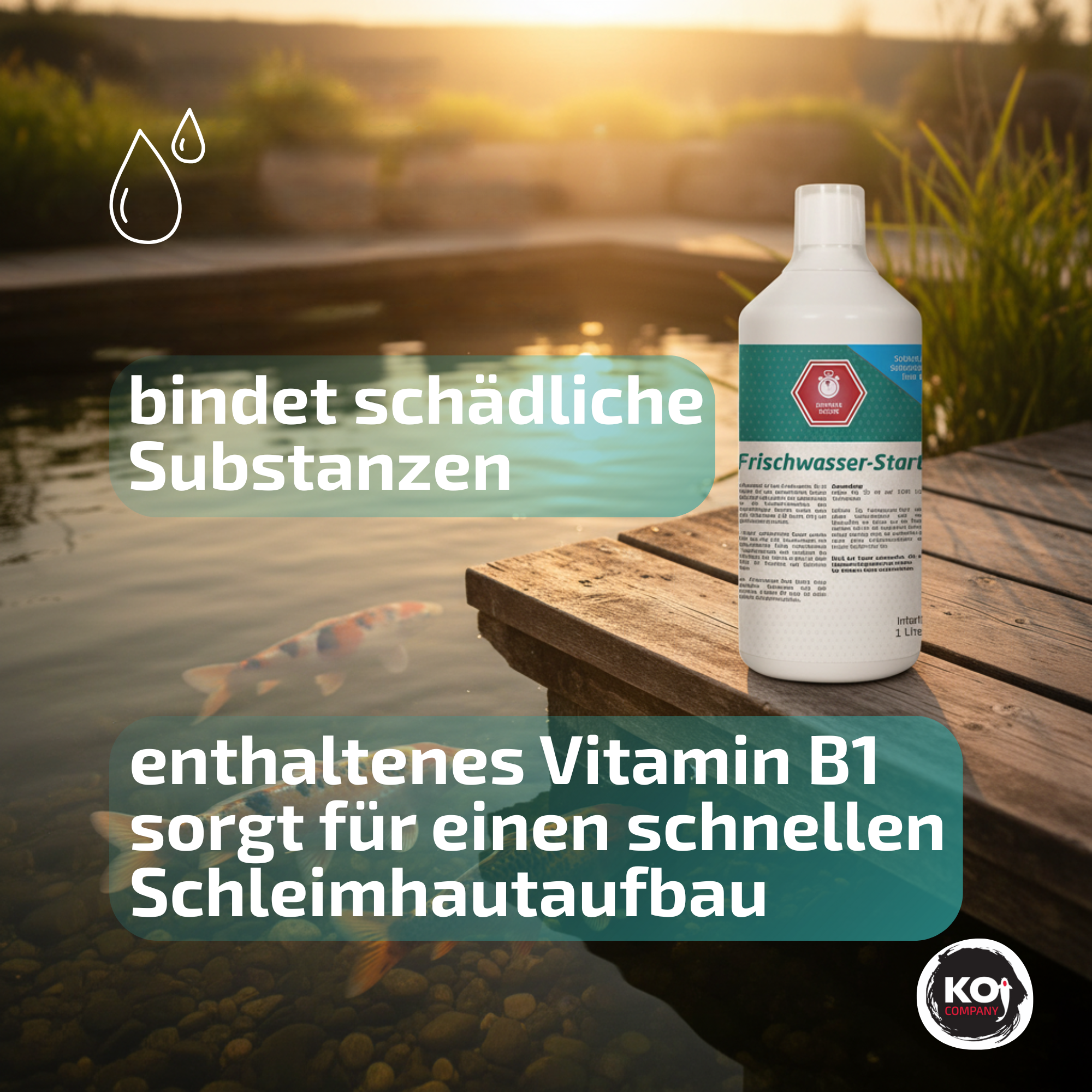 Für den Gebrauch nach Wasserwechsel, langem Regen oder Teichbefüllung. Frischwasser-Start bindet schädliche Substanzen und das enthaltene Vitamin B1 sorgt für einen schnellen Schleimhautaufbau. Macht Ihr Wasser fischgerechter.