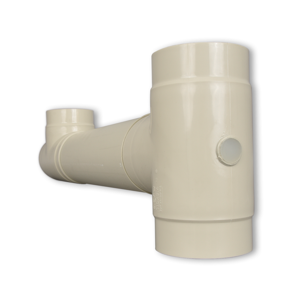Einlauf und Auslauf sind 110 mm, der Einlauf ist wahlweise rechts oder links, somit ist sie beidseitig einsetzbar. Sie haben die Möglichkeit die Ein- und Ausgänge mit unseren flexiblen Muffen (nicht im Lieferumfang) individuell anzupassen.