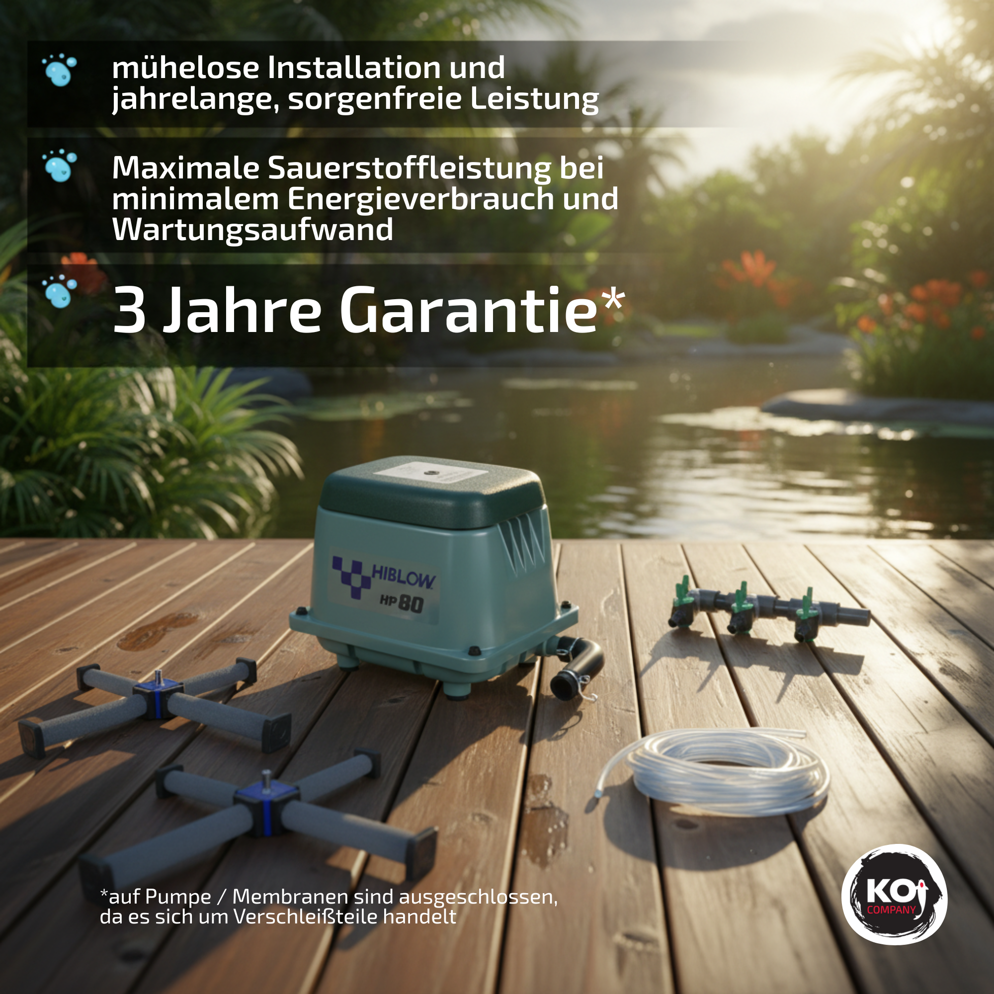 Eine Hiblow HP 80 erzeugt 80 Liter Luft pro Minute. Hier sollten Ausströmer gewählt werden die auch 80 Liter pro Minute Luft ausströmen lassen.