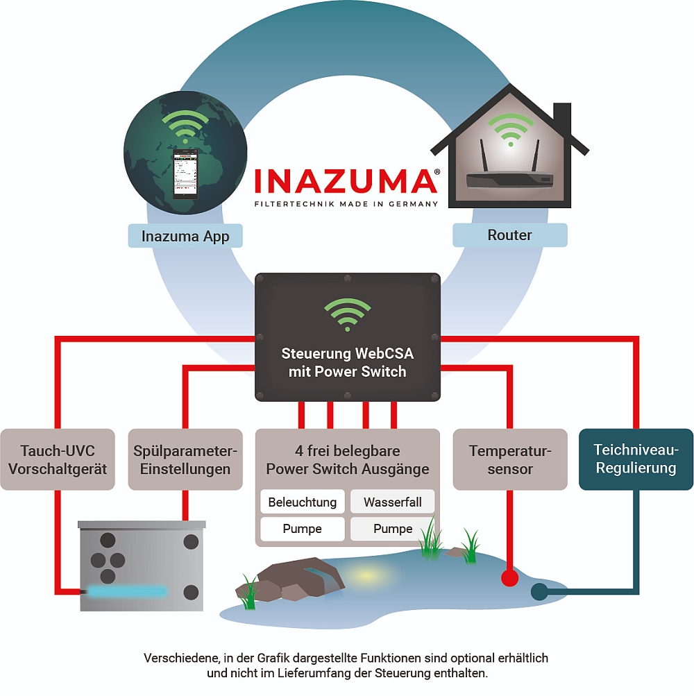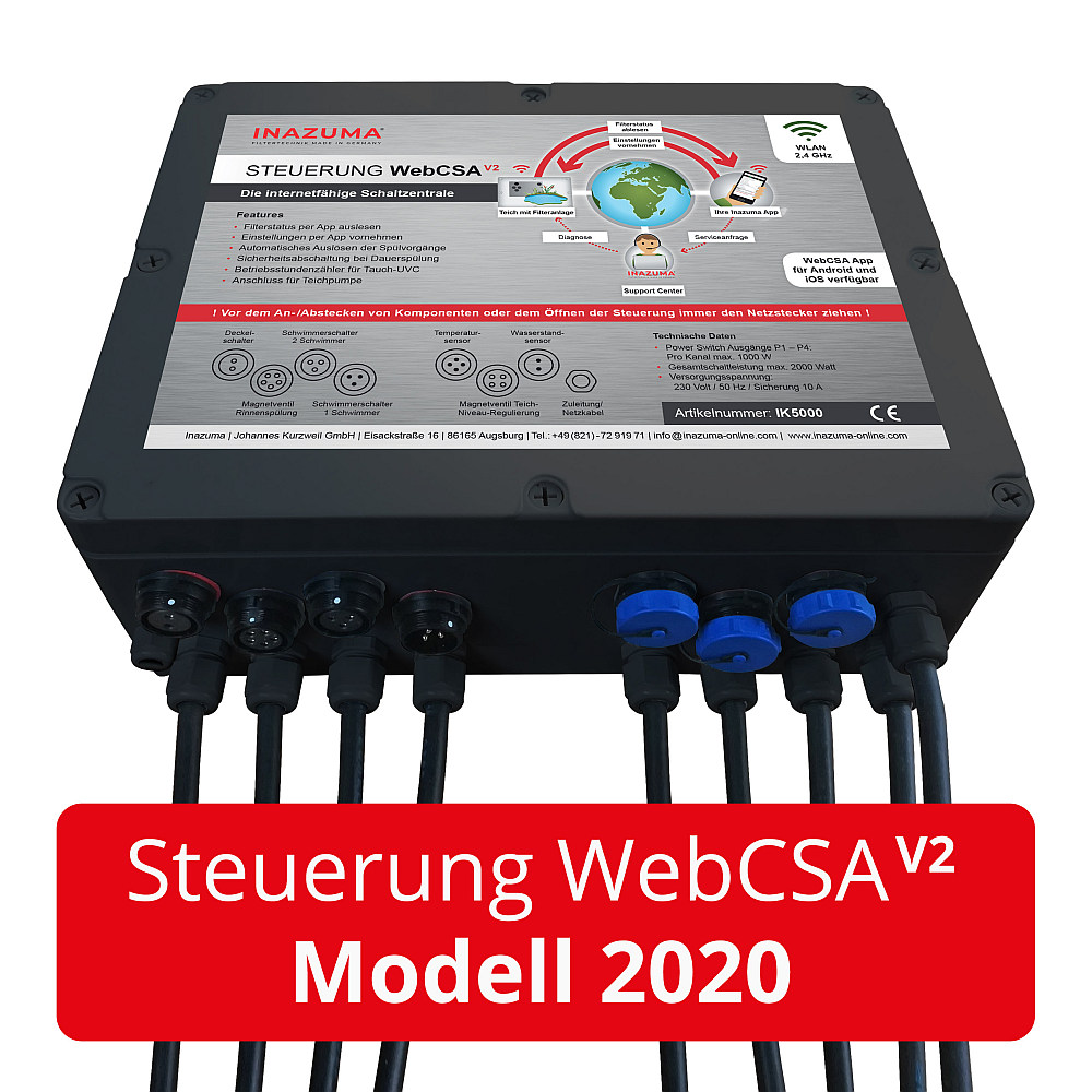 - einer Teich-Niveau-Regulierung (bestehend aus Magnetventil und Wasserstandsensor mit 10 Meter Kabel) Anschlußfertig mit Stecker für WebCSA
