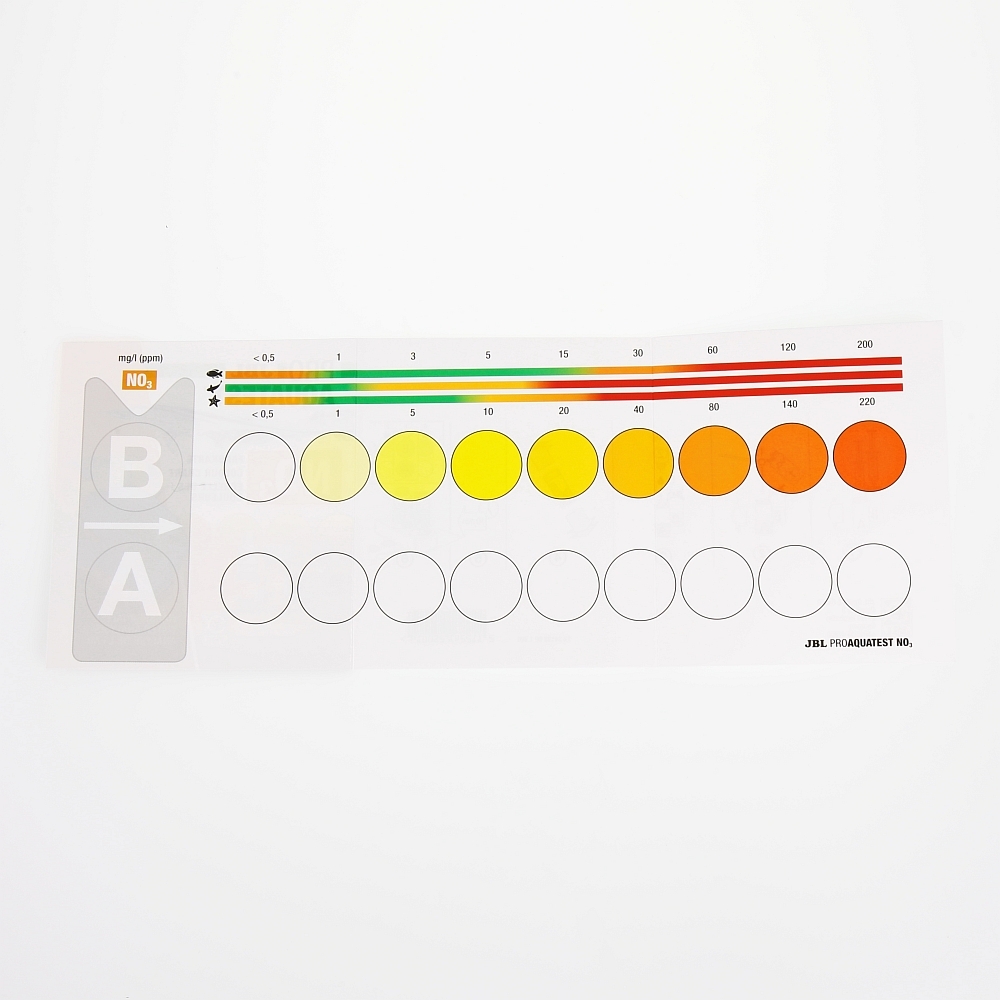 Abstufung der Werte: < 0,5; 1; 5; 10; 20; 40; 80; 160; 240 mg/l. (ppm) NO3.