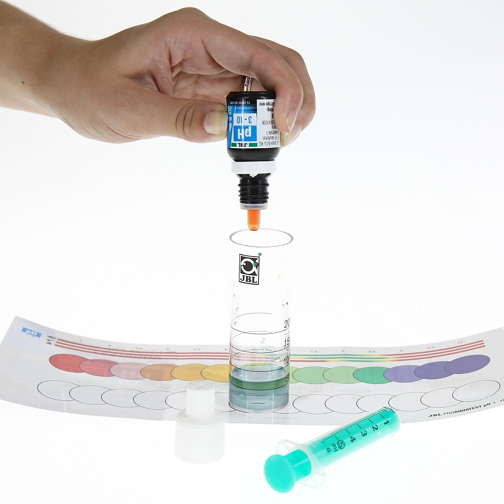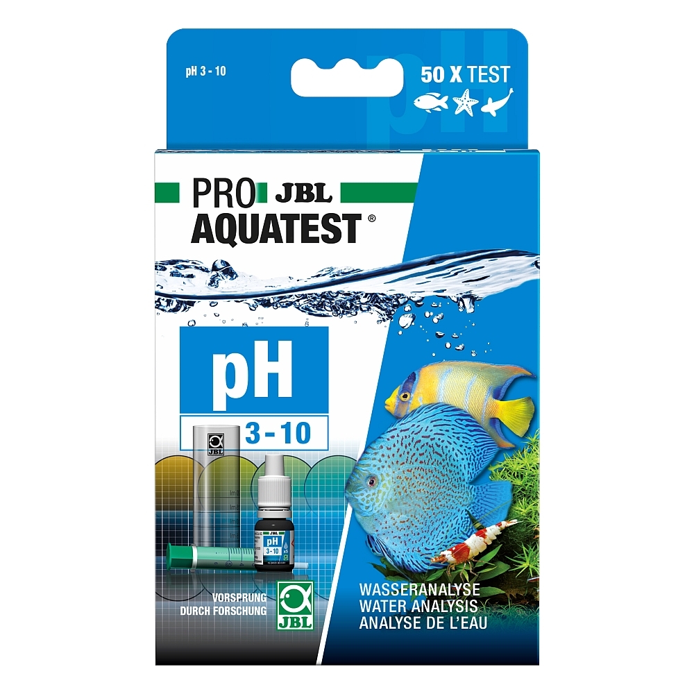 Der Test kann sowohl für Süß- als auch Meerwasser verwendet werden. Die Abstufung ist in 0,5 pH-Schritten ablesbar.