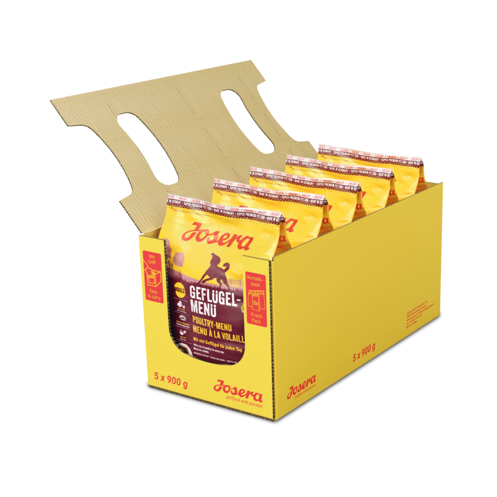 Knackige Kroketten mit ausgesuchten Zutaten und viel Geflügel – und das zu einem unschlagbaren Preis? Mit unserem Josera Geflügel-Menü bringen wir beides in Einklang. Die schmackhafte und leicht verdauliche Mahlzeit wird aber natürlich nicht nur Sie zum Jubeln bringen, sondern auch Ihre Fellnase: Denn neben einer sehr hohen Akzeptanz und guter Verträglichkeit wird sie auch von mäkeligen Hunden sehr gerne gefuttert.