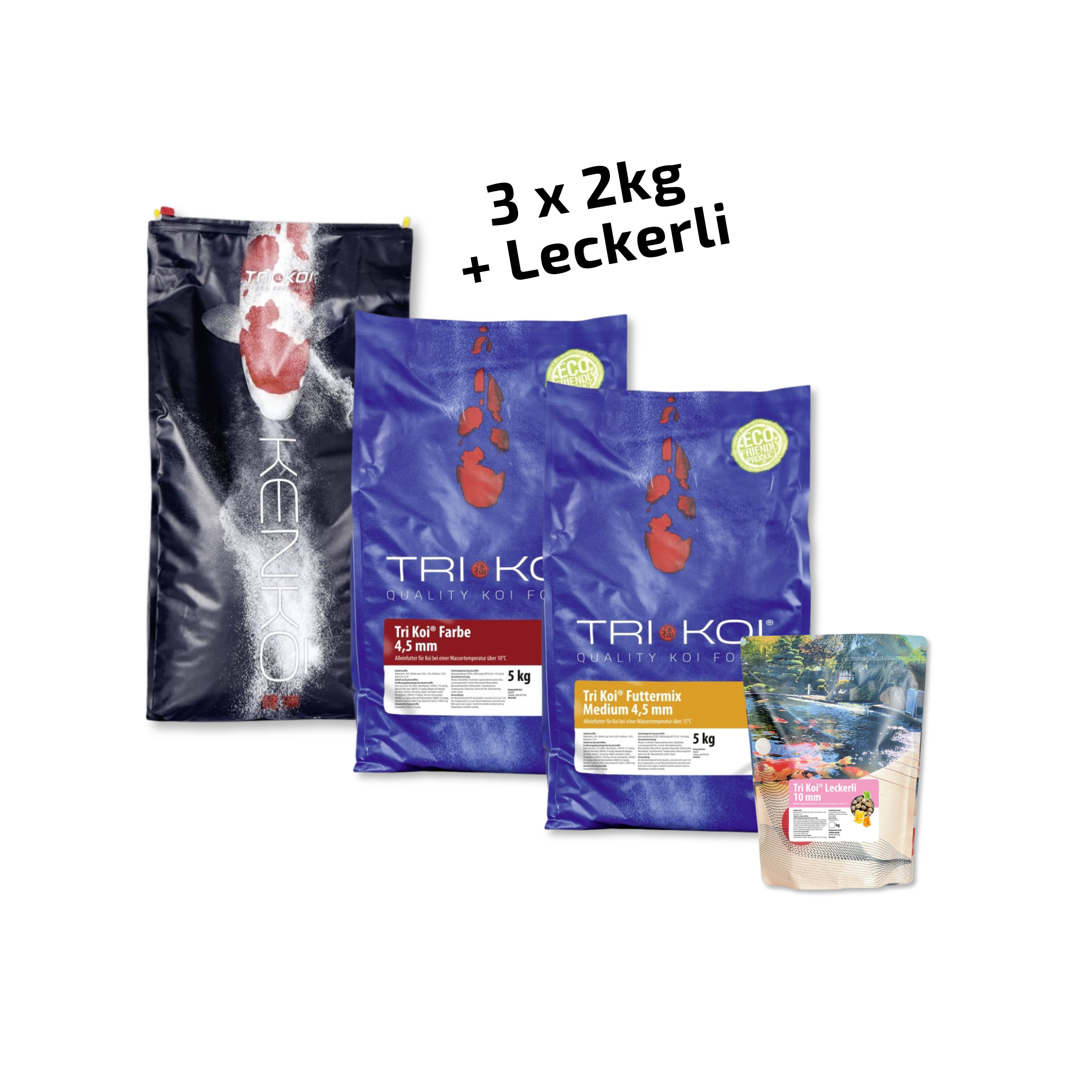 Je 2kg Kenko® Mix, Tri Koi® Farbe, Tri Koi® Mix und 1kg Leckerli zum Anfüttern.