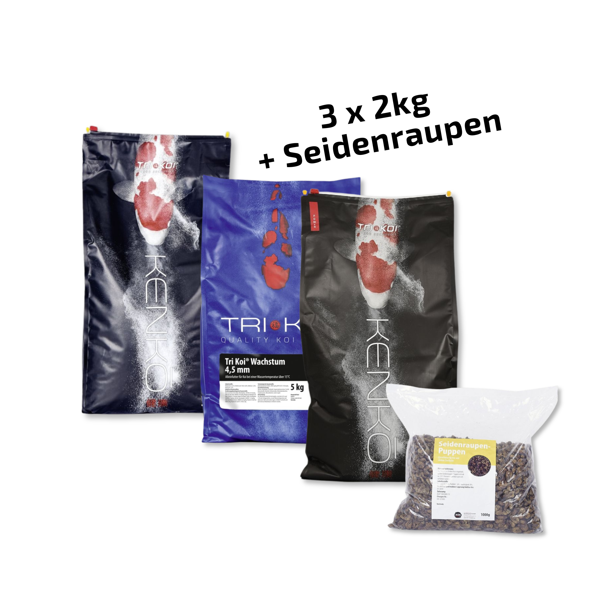 Je 2kg Kenko® Mix, Tri Koi® Wachstum, Kenko® Power und 1kg Seidenraupen zum Anfüttern.