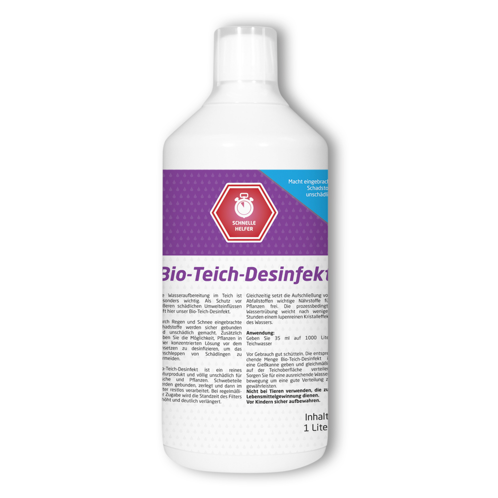 Bio-Teichdesinfekt ist durch seine Zusammensetzung in der Lage, sowohl den Keimdruck wie auch den parasitären Druck in Ihrem Teich herabzusetzen. Es ist unschädlich für Fische und Pflanzen. Es bindet Schwebeteilchen, die dann zu Boden sinken, dort zerlegt werden und im Filter von den Bakterien restlos verarbeitet werden.