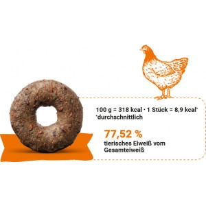 Die Getreidefreien Loopies mit Geflügel sind für alle Geflügelfleischliebhaber. Zudem wird die fettarme Rezeptur mit Süßkartoffel und Tapioka abgerundet. Die knackigen Kroketten lassen sich leicht teilen und sind somit für jede Hundegröße geeignet.