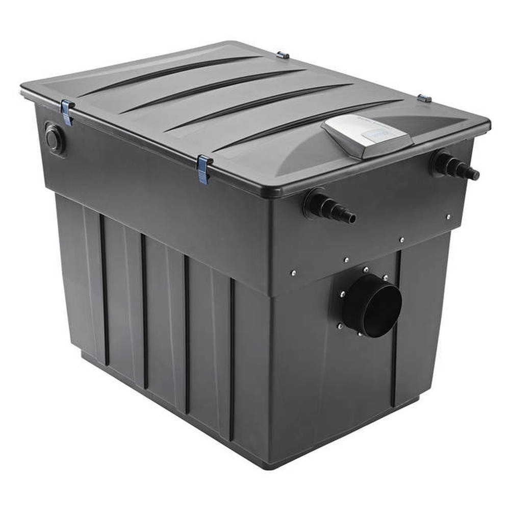 Moderner Durchlauffilter mit automatischer Grobschmutzabscheidung für Teiche bis 15.000 Liter.