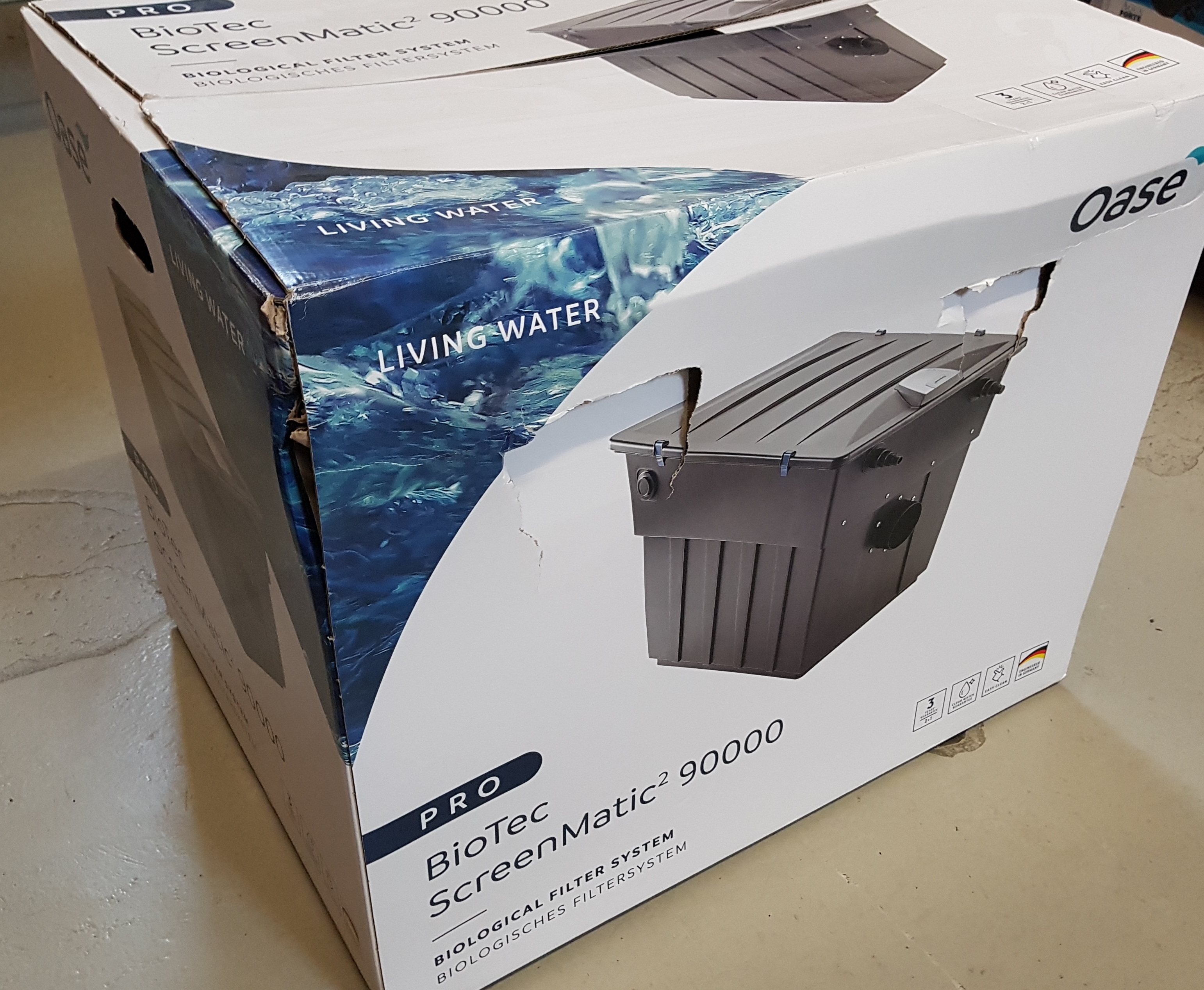 Die Oase BioTec Screen Matic² 90000 ist neuwertig, lediglich die Verpackung ist beschädigt und einer der Deckelclips fehlt. Der Body wurde durch ein Originalteil ersetzt.
