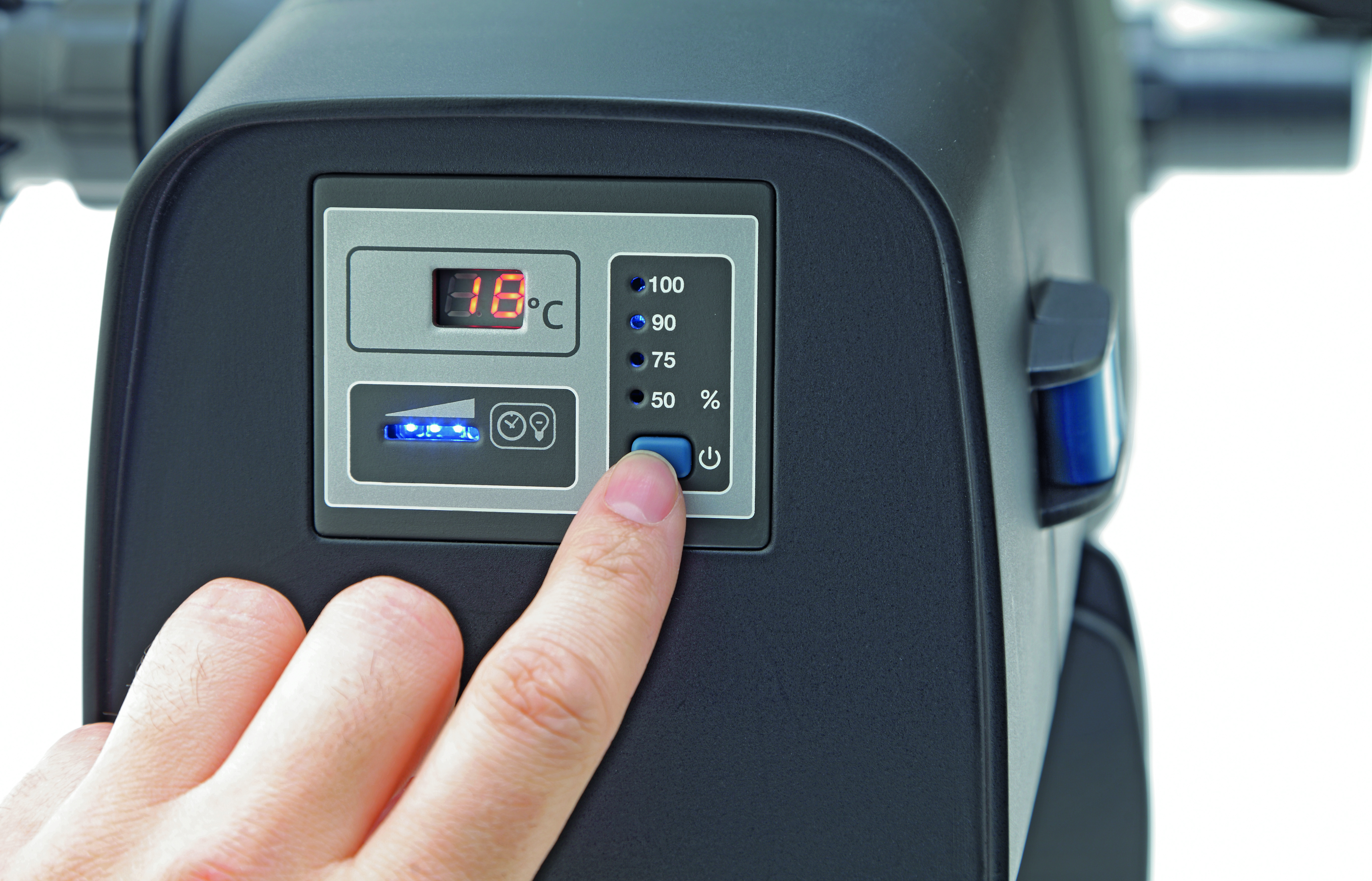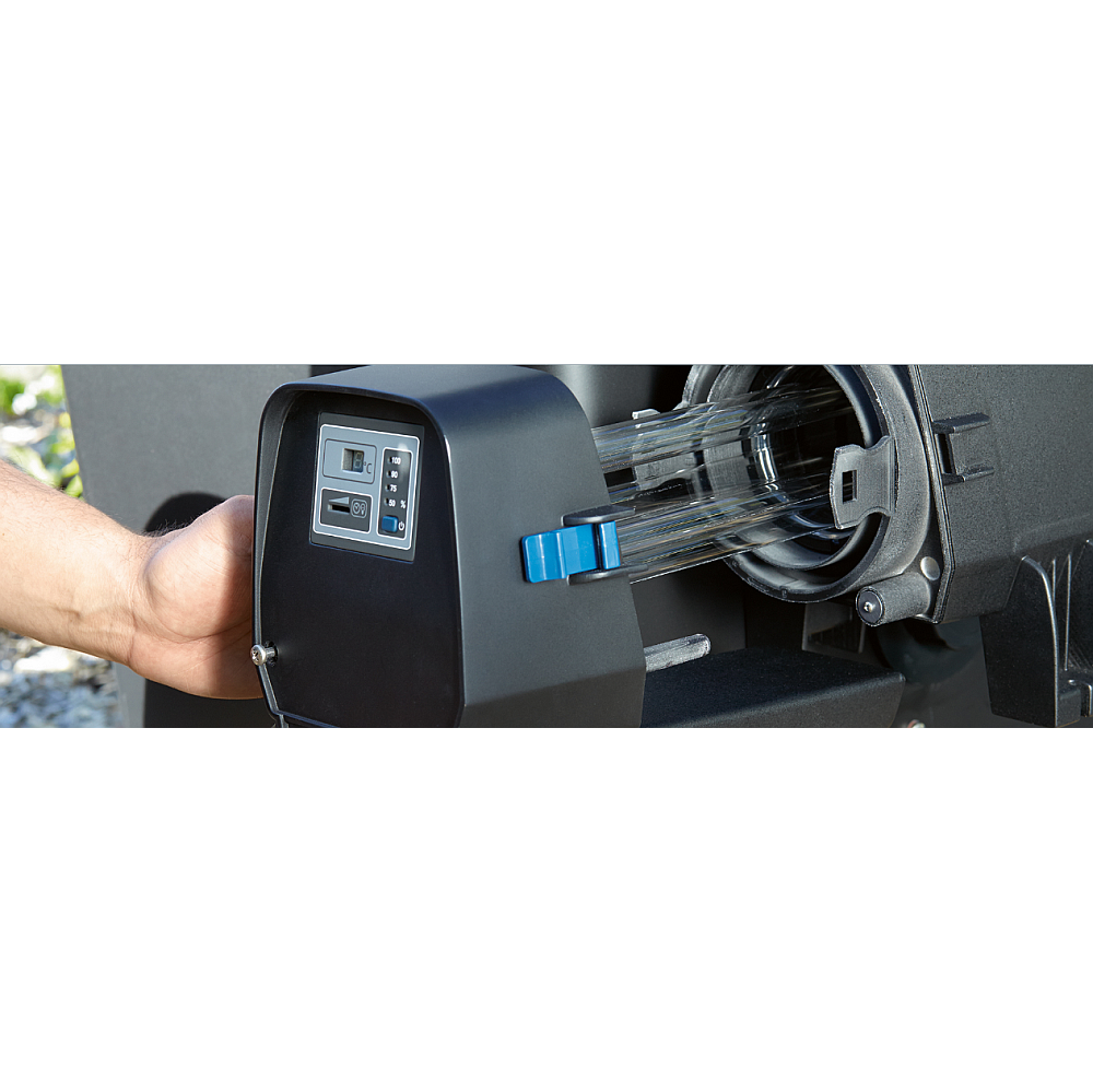 Am Gehäuse kann anhand einer Anzeige die UVC-Funktion und der nächste notwendige Lampenwechsel überwacht werden. Zusätzlich wird die Wassertemperatur mit angezeigt.