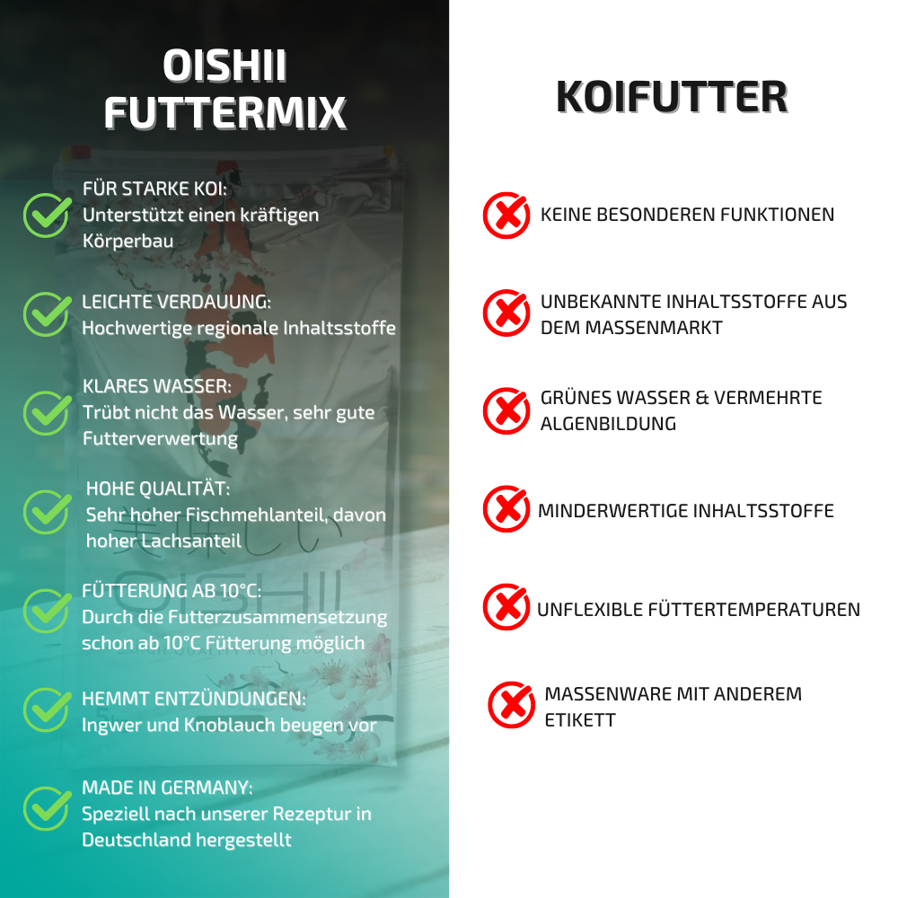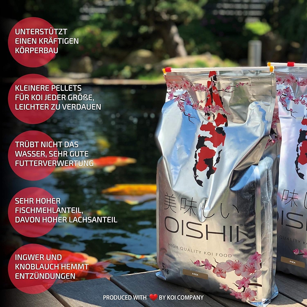 Oishii bedeutet Lecker! Und das muss ein Futter bekanntlich sein, damit unsere Koi es gerne fressen.