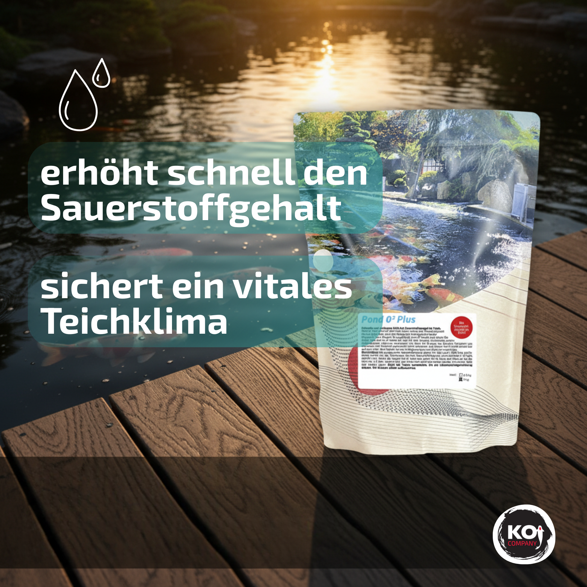 Hier ist schnelles Eingreifen erforderlich. Mit Pond O²-Plus helfen Sie sofort und wirksam. Pond O²-Plus hebt auf natürliche Weise schnell den Sauerstoffgehalt an und sorgt dafür, dass das biologische Gleichgewicht wieder hergestellt wird. Um das erfolgreich zu testen haben auch O²-Tests im Angebot. Messen Sie regelmäßig Ihren O²-Gehalt und stellen Sie sicher, dass sich Ihr O² Gehalt bei über 6,5 mg/L bewegt.