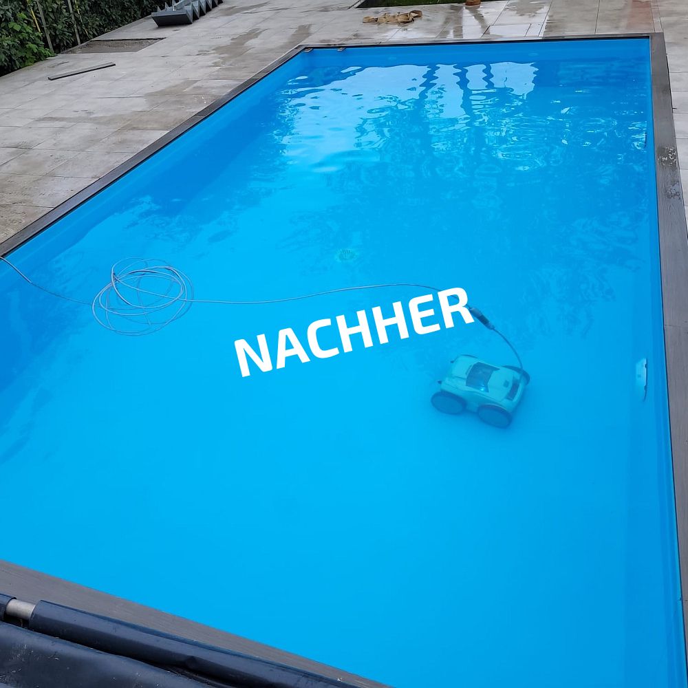 Biopoolreinigungsroboter mit Vollautomatischer Beckenerfassung (“Sensor Nav System™”) und Reinigungsfunktion.
