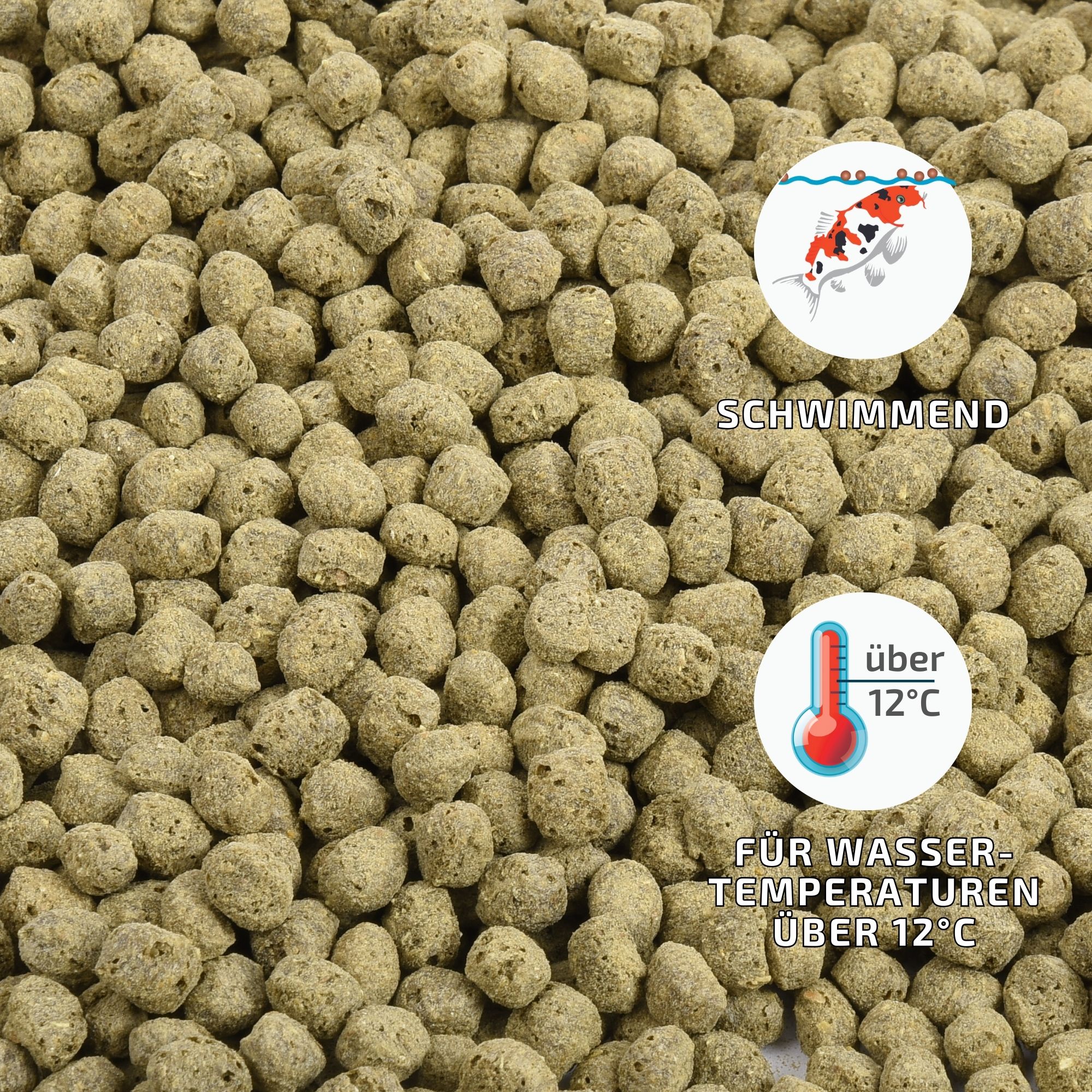 Füttern Sie Ihre Koi in Abhängigkeit von der Wassertemperatur 1-3 x täglich. Als Alleinfuttermittel für Koi Karpfen, zwischen 0,2% und 1,5% des Fischgewichtes, je nach Wassertemperatur und Jahreszeit.