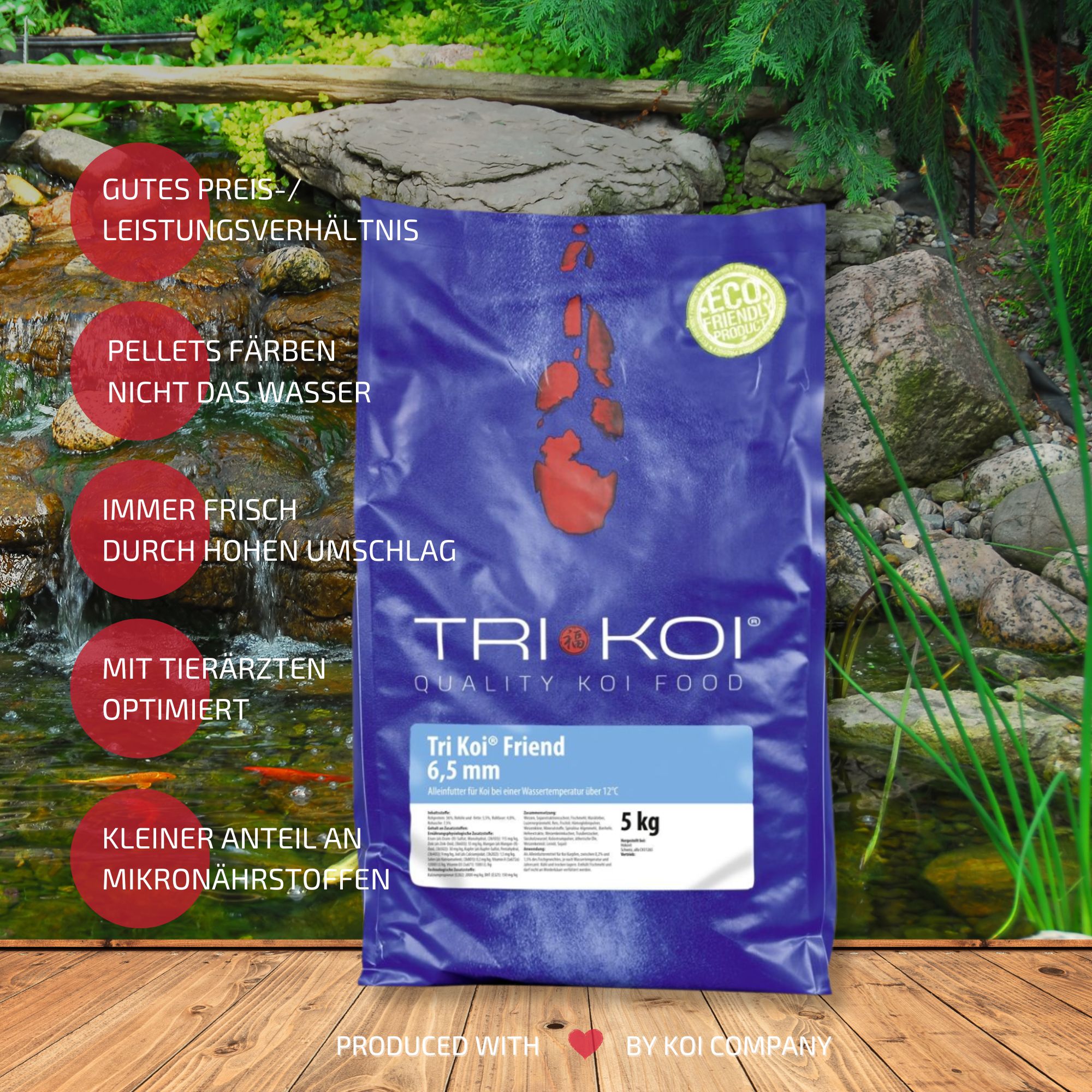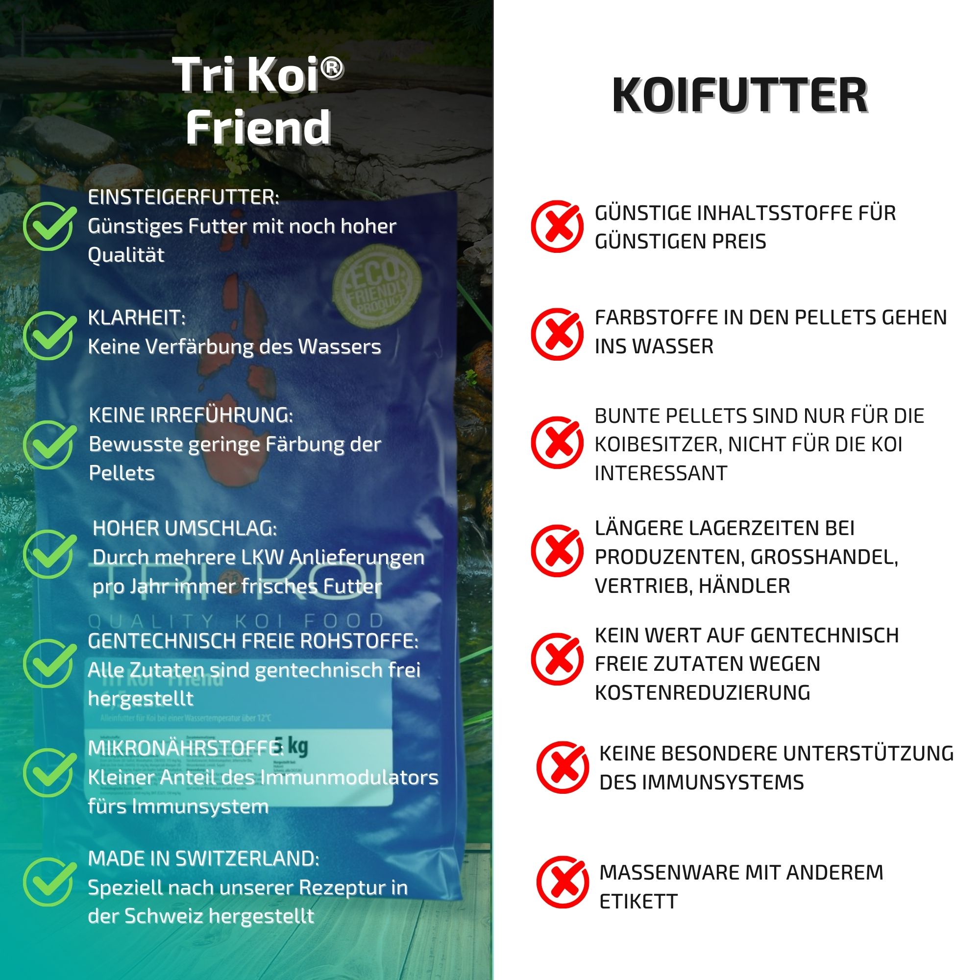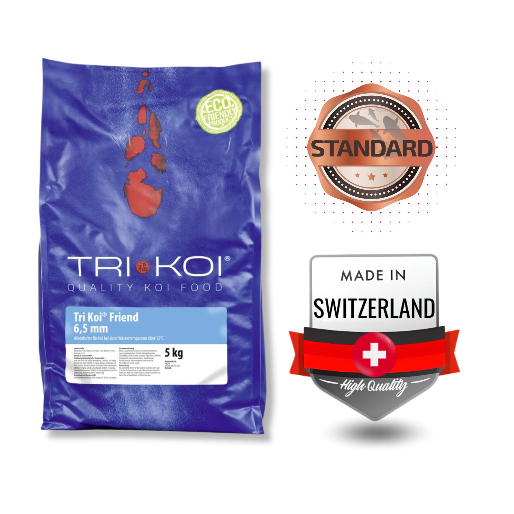 Tri Koi® Friend steht für unser preiswertes Einsteigerfutter. Vom berühmten Namenspaten inspiriert ließen wir uns damals ein einfaches Futter für den kleinen Geldbeutel herstellen. Diese Zusammensetzung wurde mit dem Wechsel zu Hokovit qualitativ nochmal deutlich gesteigert. Seitdem können Teichbesitzer, die weniger für Ihr Koifutter ausgeben möchten, auf ein Futter zurückgreifen, welches in Bezug auf Preis/Leistung unschlagbar in der Branche ist. Kaufen Sie kein günstiges Futter, das um den halben Erdball reisen musste.