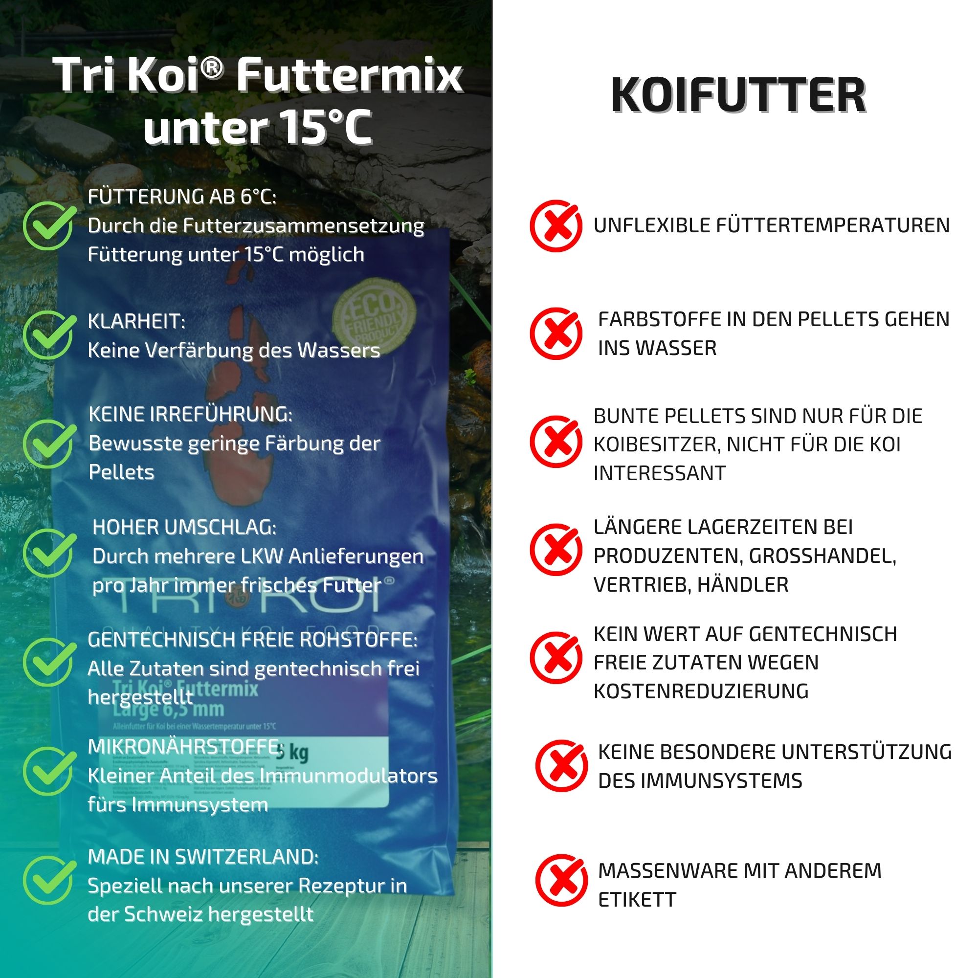 Wenn Sie sich mit dem Hersteller näher auseinandersetzen (Alpha CH 31265) werden Sie zwangsläufig auch auf den exklusiven Mikronährstoffkomplex AQUACULTURE GUARD® stoßen. Dieser Stoff ist in jeder unserer Tri Koi® Futtersorten von Hokovit enthalten, sowie die exklusive Kräutermischung aus dem Kenko® Extra.