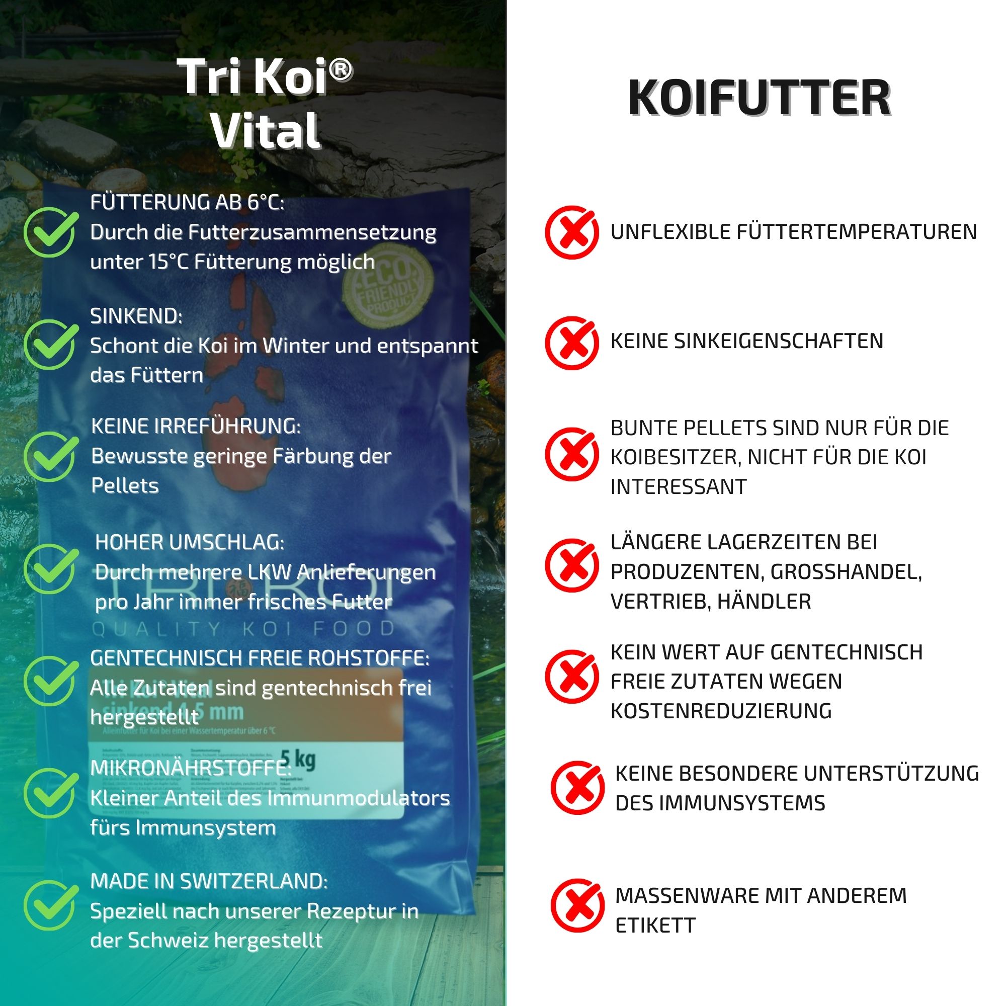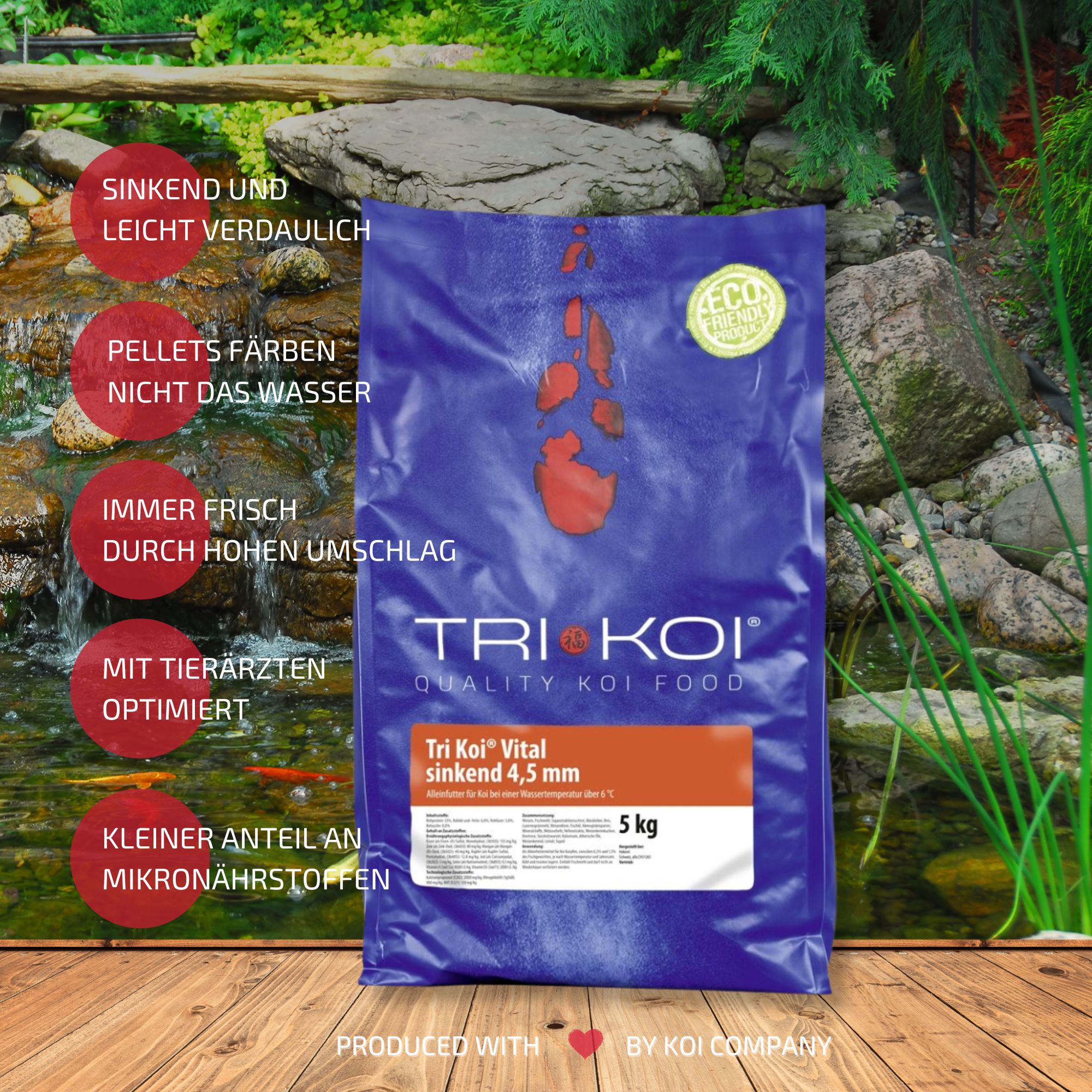 Tri Koi® Vital ist ein sinkendes Futter und ist besonders für Temperaturen zwischen 6° und 10° C geeignet. Somit ist dieses Futter ideal für die kalte Jahreszeit geeignet. Zusätzlich eignet sich dieses Futter auch für alle Tiere, die sich gerne im schwebenden oder gründelnden Bereich bewegen. Ideales Koifutter auch für ältere Koi, Innenhälterungen, bei Filterproblemen oder zur Einmischung von Arzneimittel.