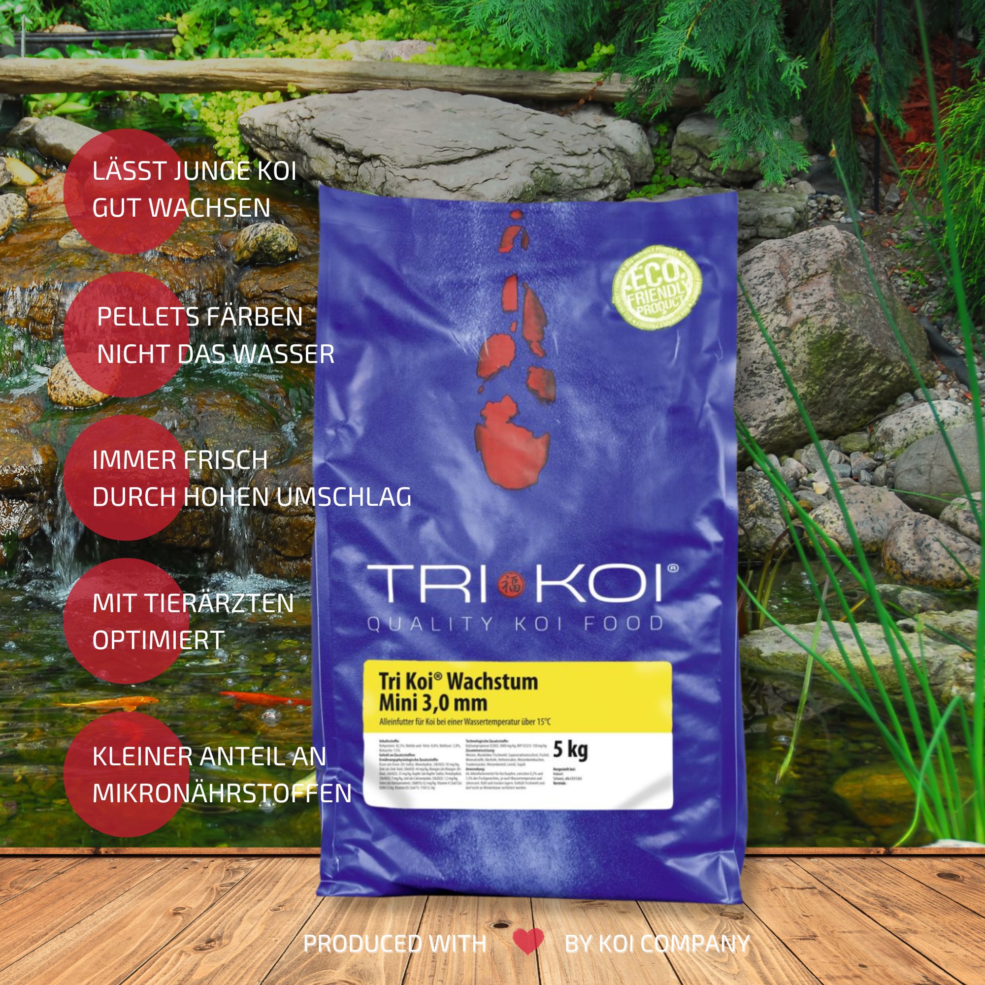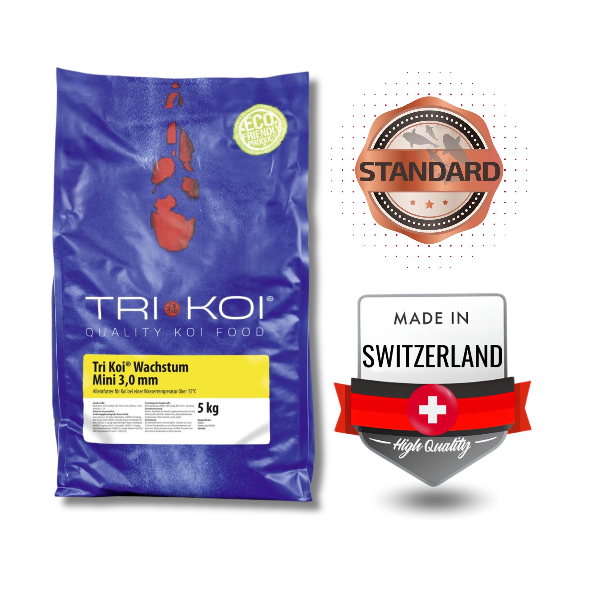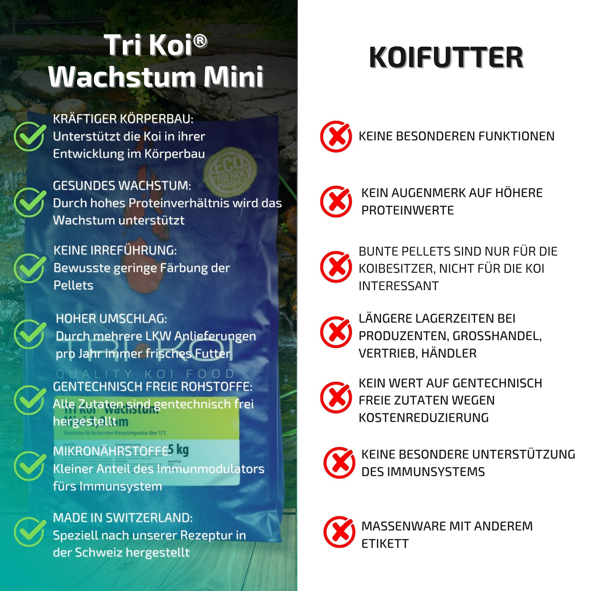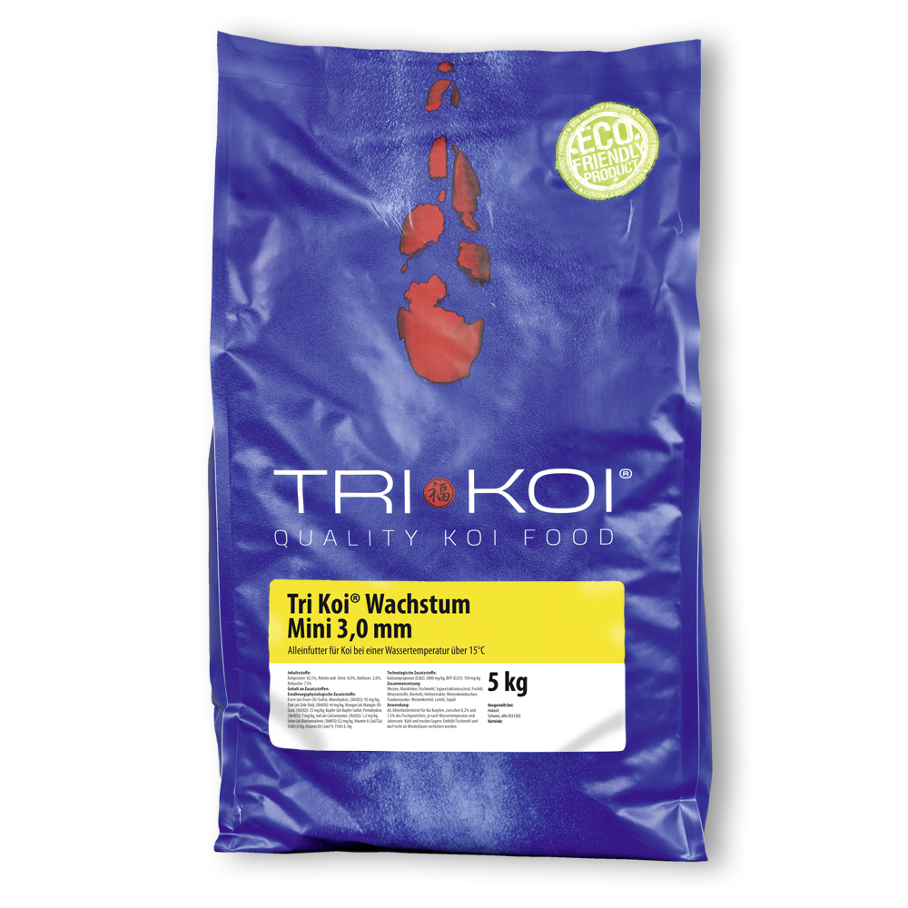 Tri Koi® Wachstum Mini Pellets: hier wurde besonderes Augenmerk auf die Entwicklung der jungen Koi gelegt. Mit diesem Futter werden Ihre Koi rasch größer, ohne dass Sie verfetten. Es handelt sich um ein Alleinfutter und Konditionsfutter, es kann aber auch mit anderen Futtersorten vermischt werden. Für Tiere ab einer Größe von 10 cm, perfekt für Tosai.