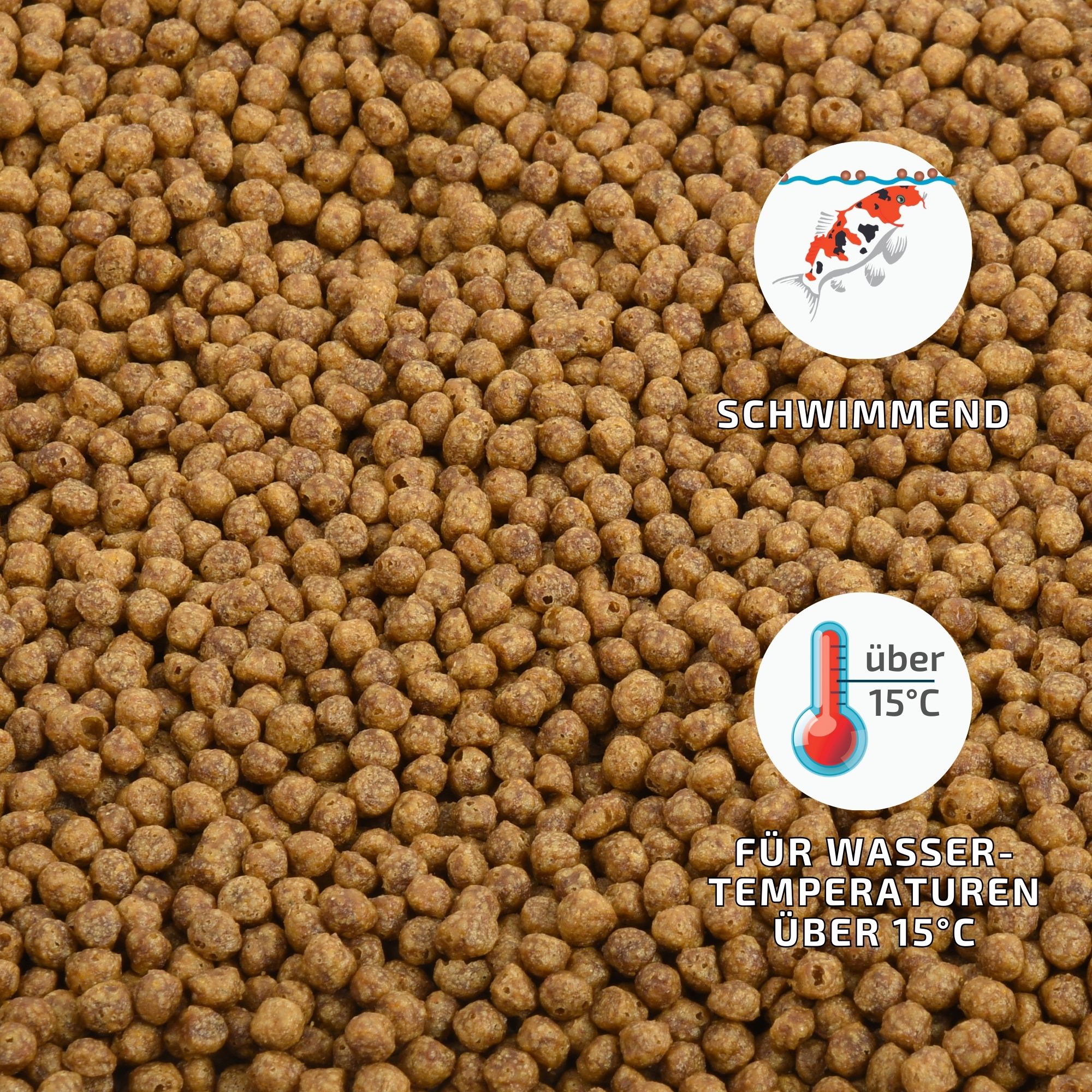 Füttern Sie Ihre Koi in Abhängigkeit von der Wassertemperatur 1-3 x täglich. Als Alleinfuttermittel für Koi Karpfen, zwischen 0,2% und 1,5% des Fischgewichtes, je nach Wassertemperatur und Jahreszeit.