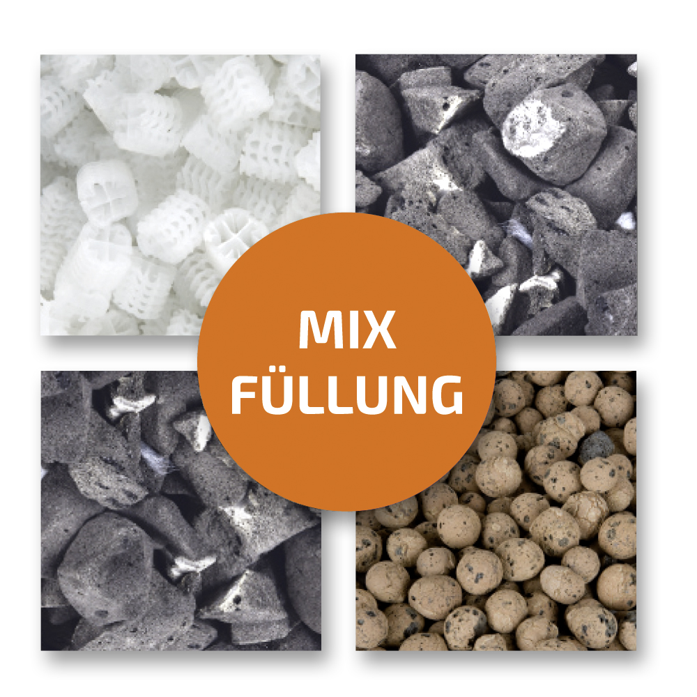 Zum Befüllen des Filters empfehlen wir als Filtermedium Siporax, New² Bio Crystal, Hel-X®, AquaClear, Nana Taro oder auch Austernschalen. Diese Filtermedien werden mit leichtem Sauerstoff überzogen und sind optimal für die Entwicklung von nützlichen Bakterien für die Nitrifikation. Besonders in der warmen Jahreszeit sorgt der Sauerstoff mit für eine optimale Belüftung im Teich. Benutzen Sie aber immer poröse Filtermedien, damit die Bakterien sich ansiedeln können.