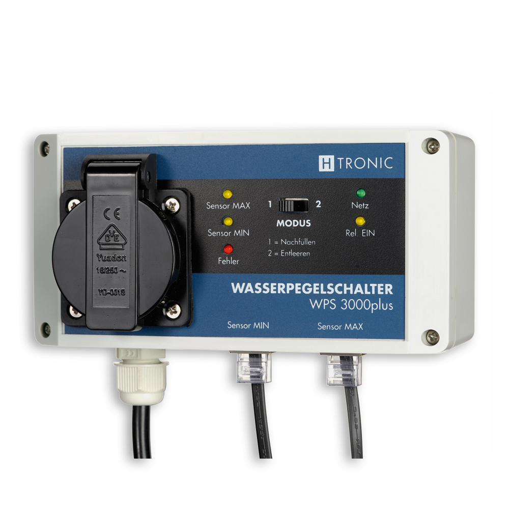 Mit dem WPS 3000PLUS können Sie mit zwei Wassersensoren (10 m Kabel) Ihr Niveau kontrollieren. Schließen Sie einfach z.B. das Magnetventil mit Hilfe des Trafo an die Steckdose an.